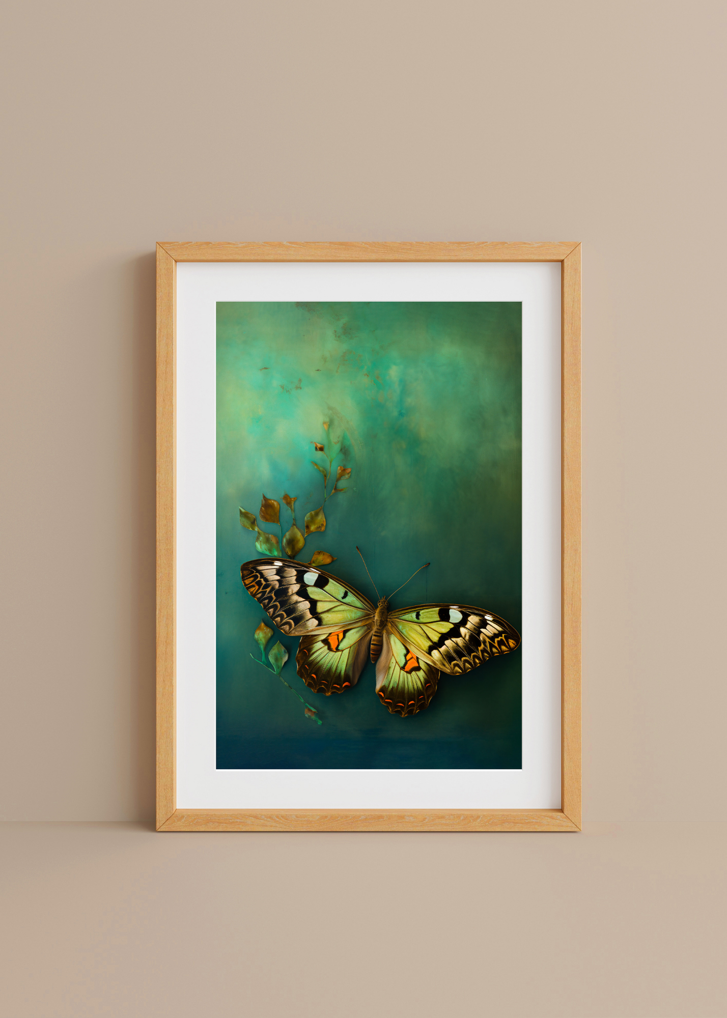Green Whispers— Like a secret garden pressed between pages, this butterfly rests amid delicate gold and green stems. Its wings are kissed with soft citrus and smoky black, as if echoing the colors of dusk-touched wildflowers. The background melts in watercolor swirls of moss and aquamarine, evoking the gentle mystery of a hidden grove. A graceful piece for those drawn to the poetic and the peaceful.