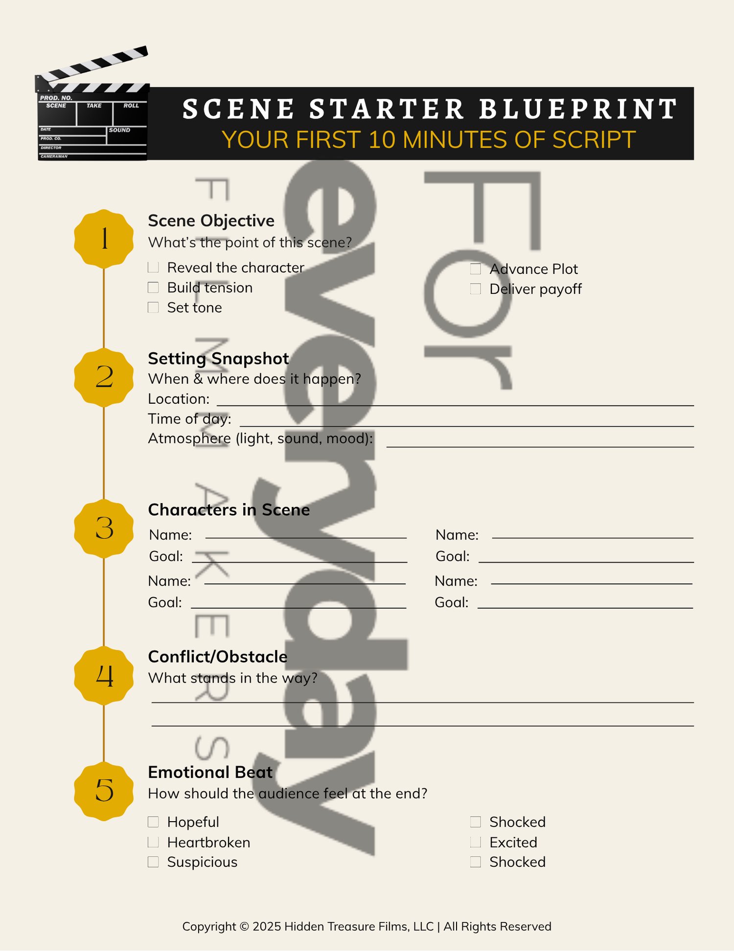 Jumpstart your screenplay with the Scene Starter Blueprint, a one-page, fill-in-the-blank guide that helps you plan compelling scenes with clarity and confidence. This blueprint walks you through essential storytelling elements so every scene drives your story forward.