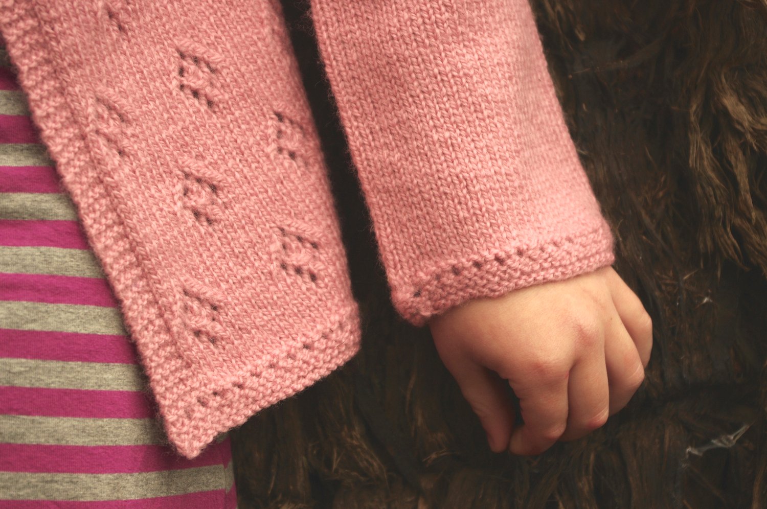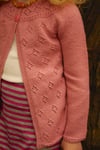 Posy is part of a series of knits designed to coordinate with the popular Bloom dress. It features the same diamond lace through the body and the yoke as on the dress’s body and hemline.