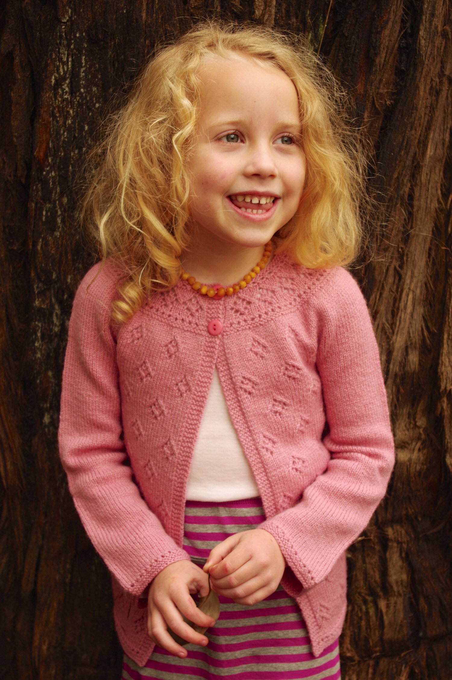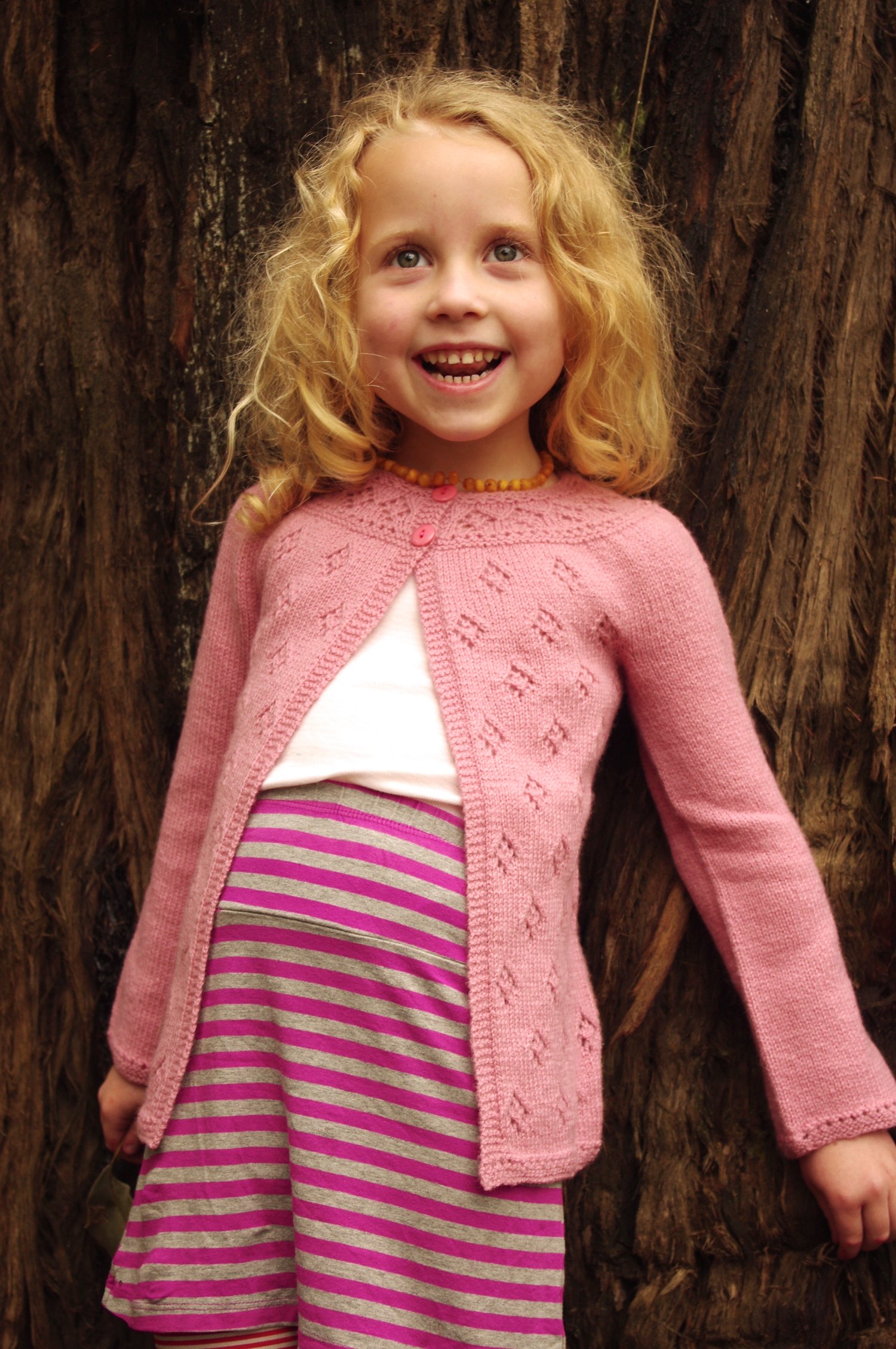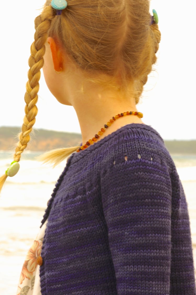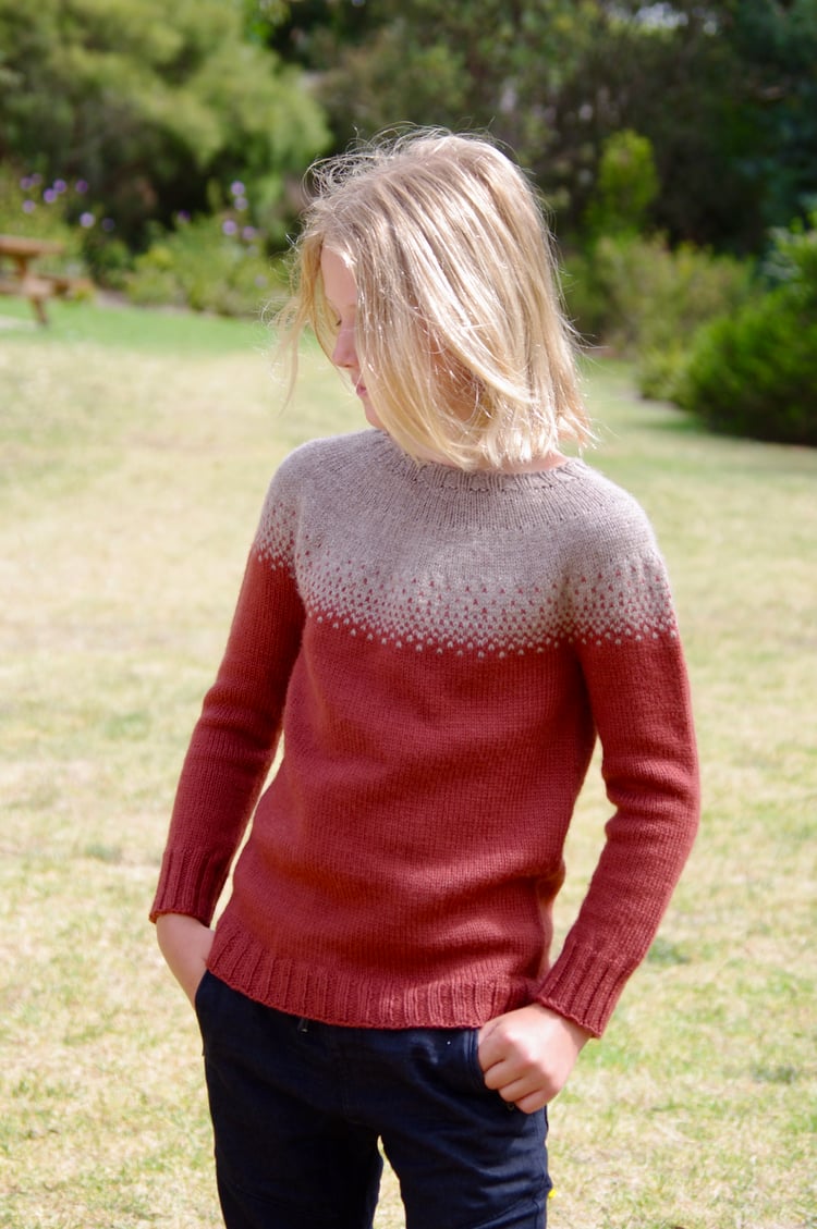Sample shown is the 21” size knit to a 5 year length on a 5 year old with a 21” chest.