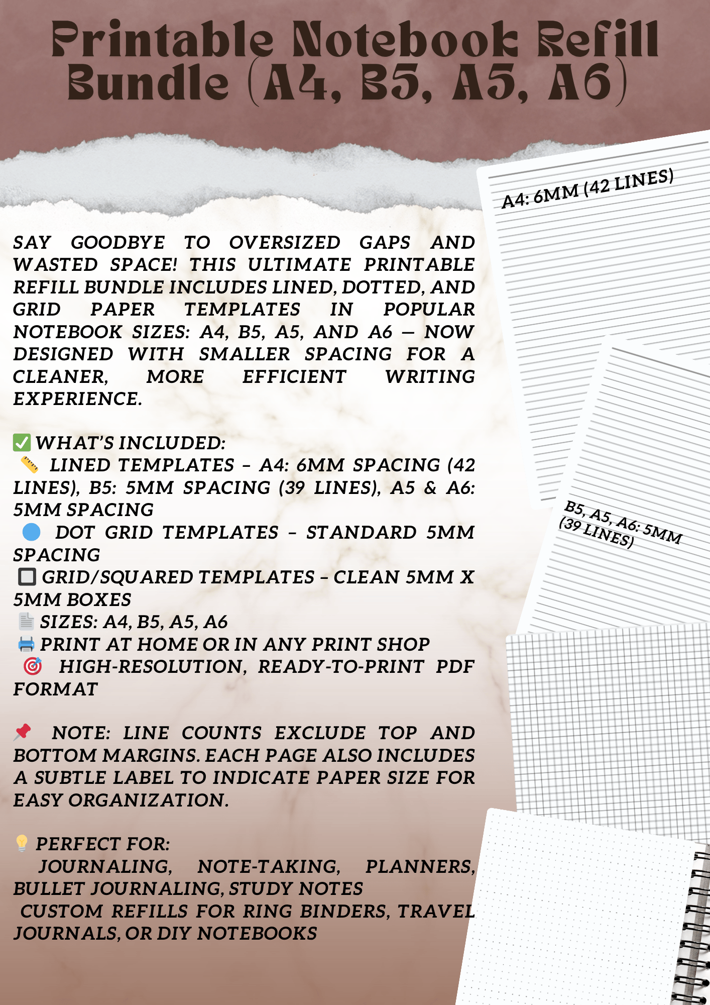 Say goodbye to oversized gaps and wasted space! This ultimate printable refill bundle includes lined, dotted, and grid paper templates in popular notebook sizes: A4, B5, A5, and A6 — now designed with smaller spacing for a cleaner, more efficient writing experience.