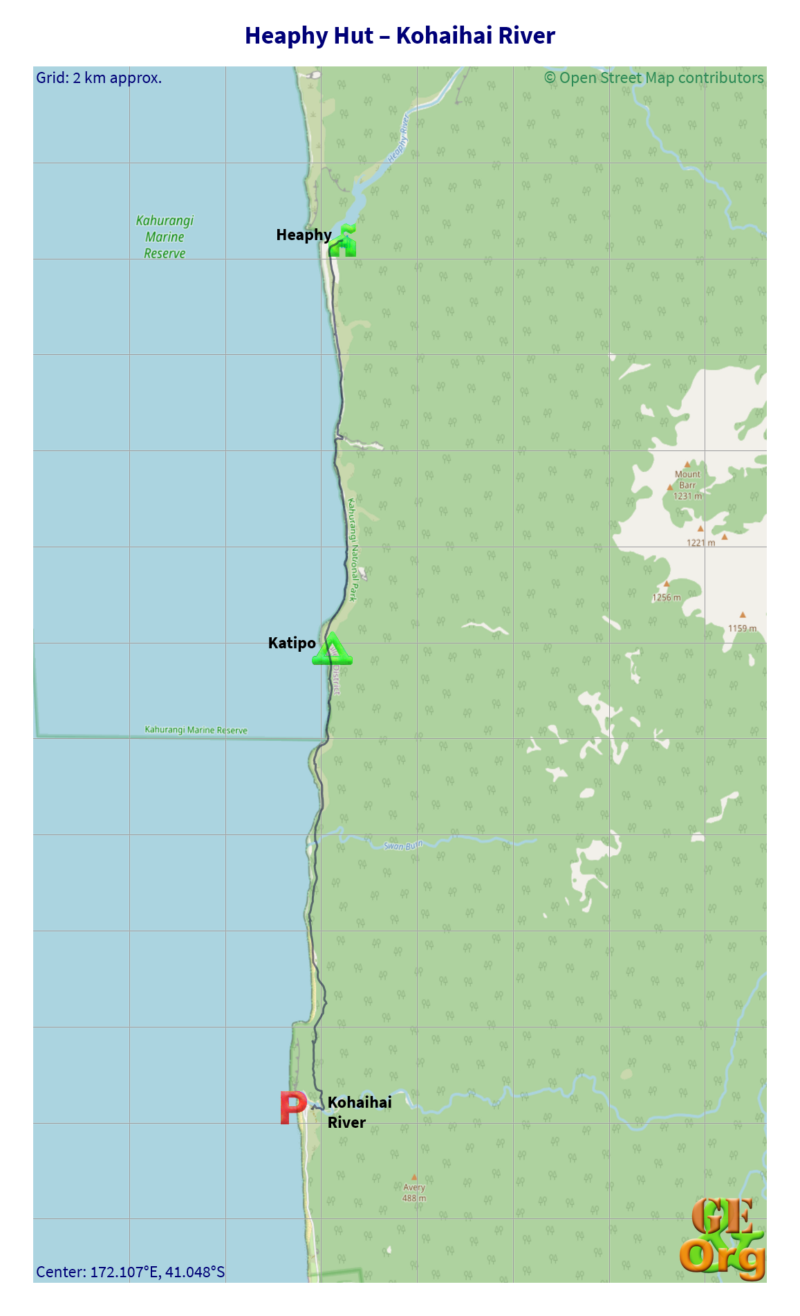 Heaphy Hut to Kohaihai River Carpark, gpx file, OpenStreerMap.