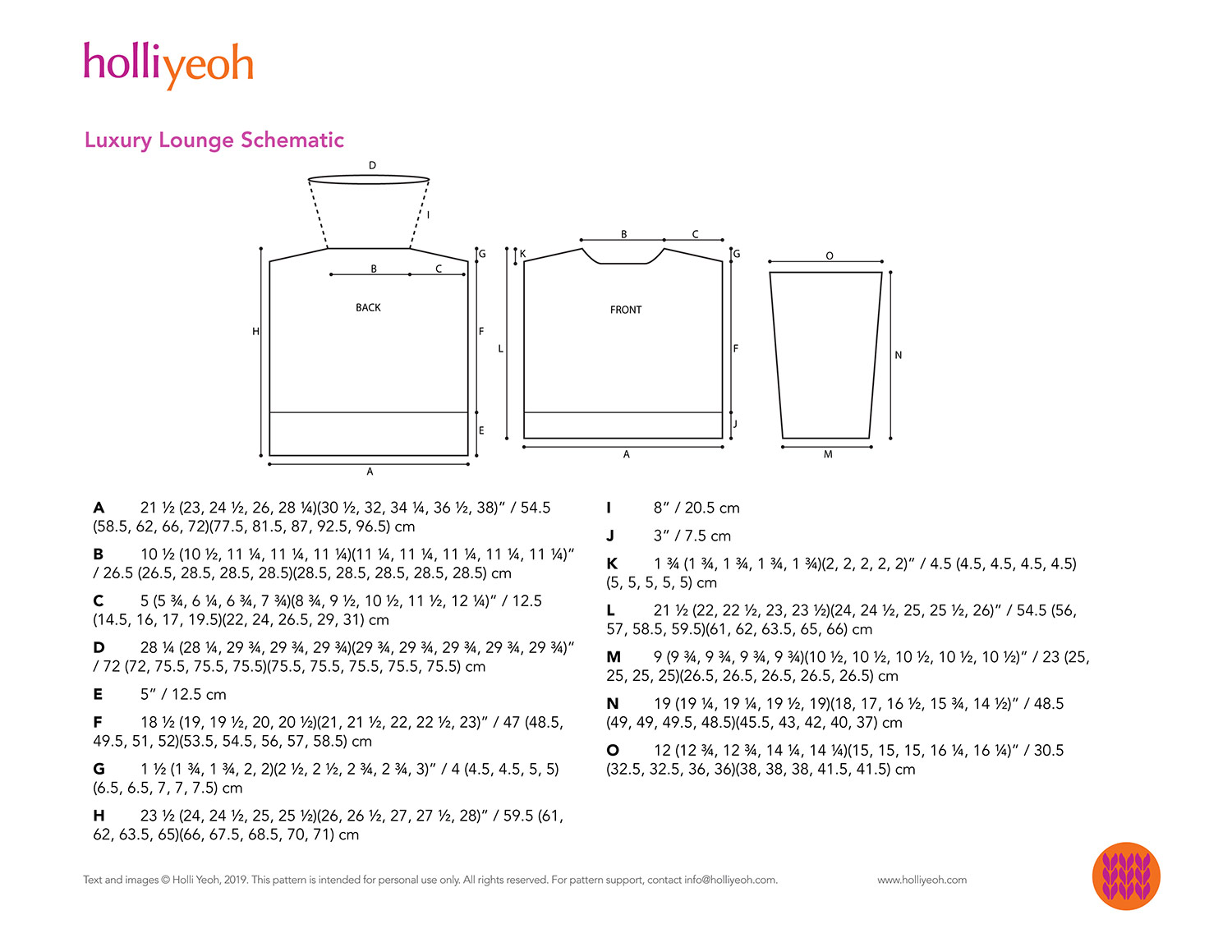 Back length: 23 ½ (24, 24 ½, 25, 25 ½)(26, 26 ½, 27, 27 ½, 28)" / 59.5 (61, 62, 63.5, 65)(66, 67.5, 68.5, 70, 71) cm.