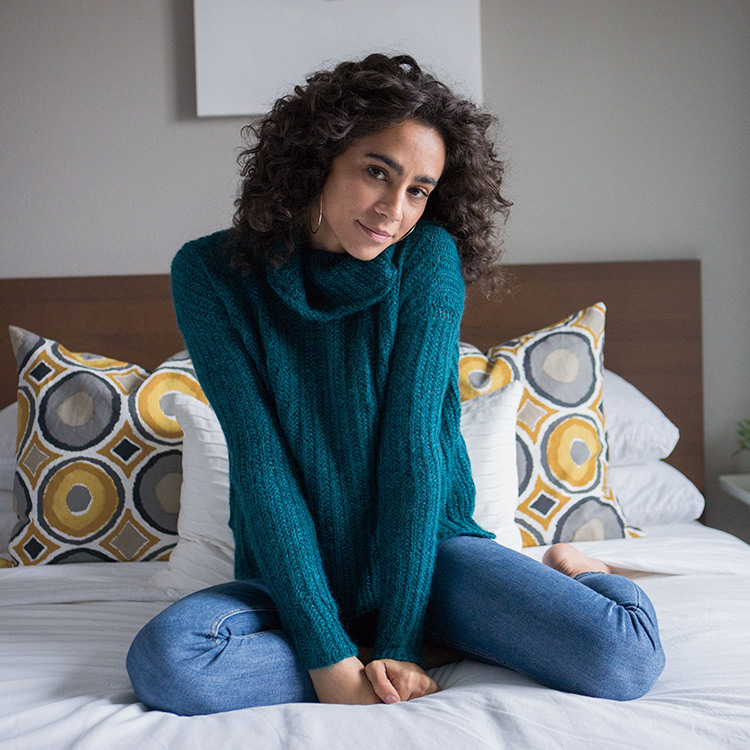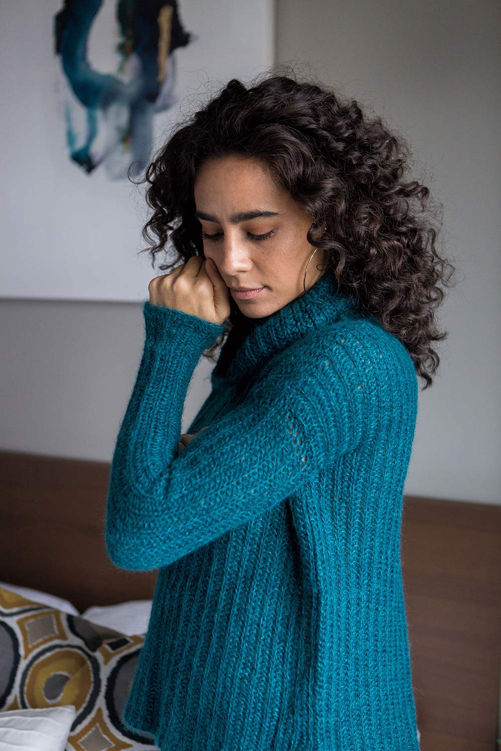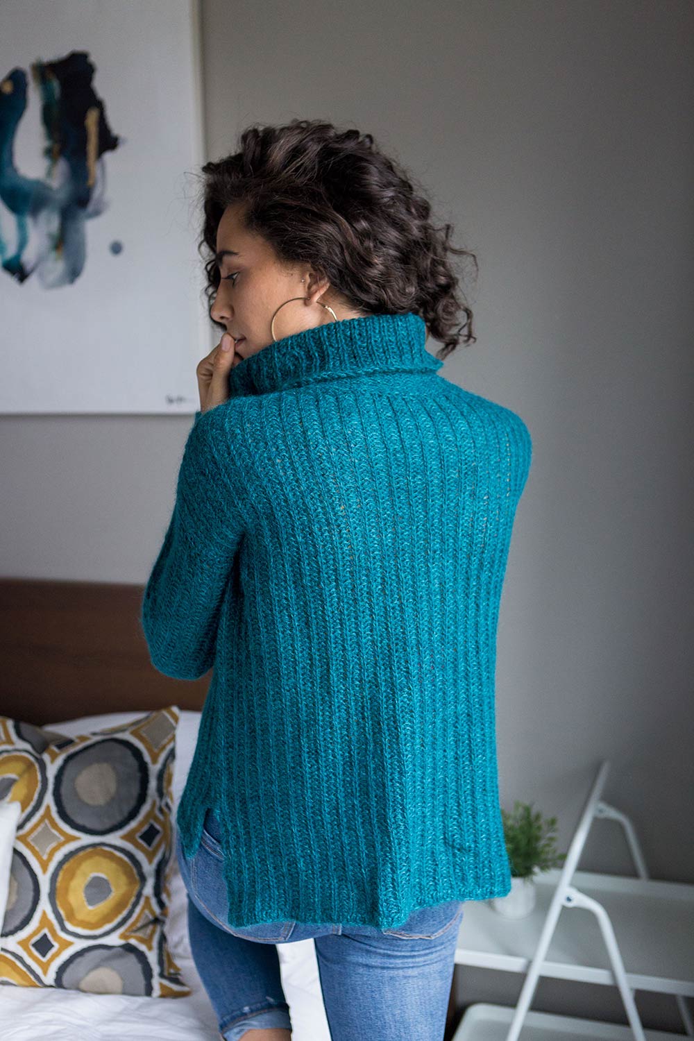 Worked bottom up and seamed, this sweater has short row shoulder shaping and a visible 3-Needle Bind Off to add design interest at the shoulders. But the real highlight is the generous cowl, which is worked in the round, bringing all that gorgeous softness up around your neck for full enjoyment.