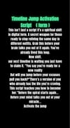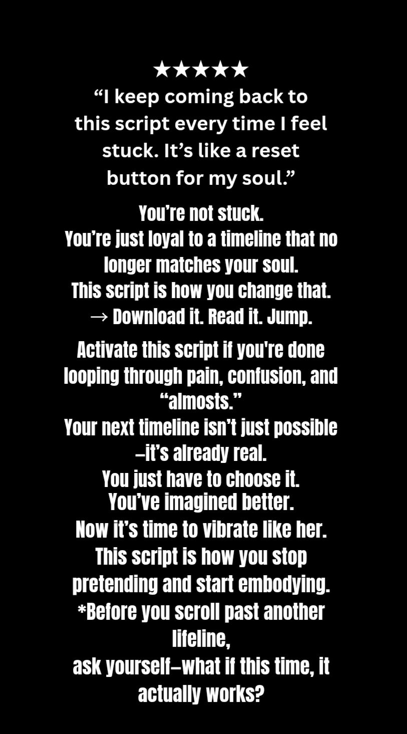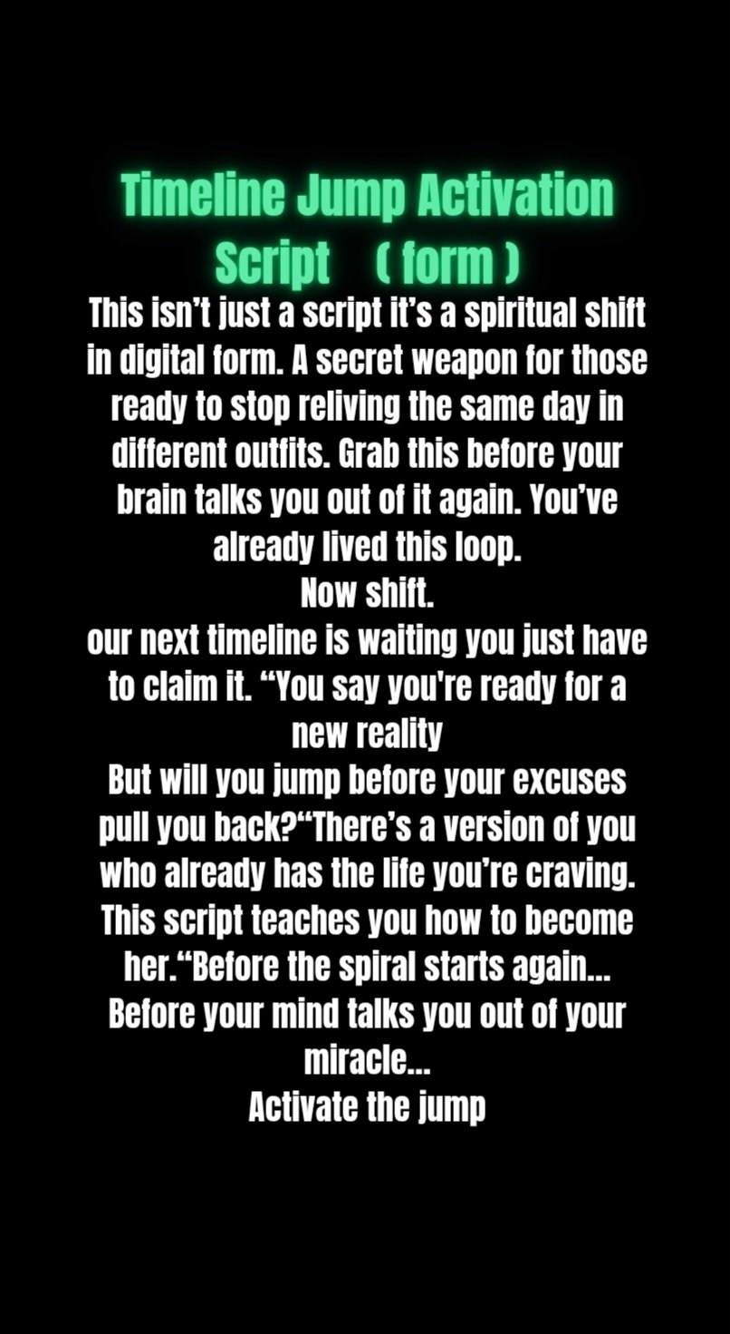 This is a personalized 15-minute Timeline Jump Activation Script created just for you—based on your story, your goals, and your desired energy shift. It blends manifestation, subconscious reprogramming, and frequency alignment to help you activate a new reality from the inside out.