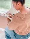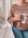 Beginning with a provisional cast-on, you’ll start at the neckline, working in the round and increase incrementally using backward loops to form the yoke. You will then separate the sleeves and body and work each separately in the round. Once the length of the body and each sleeve are reached and bound off, you’ll undo the provisional cast-on and pick up each stitch. A round of eyelets followed by a wide ribbed collar will finish off your piece.