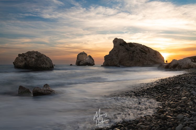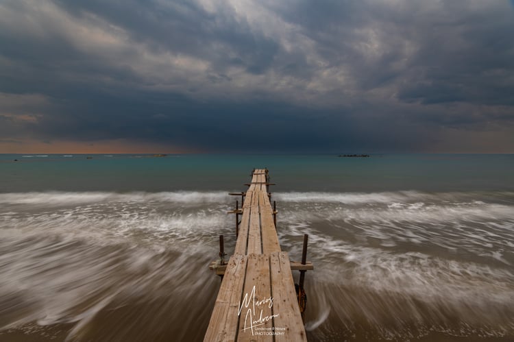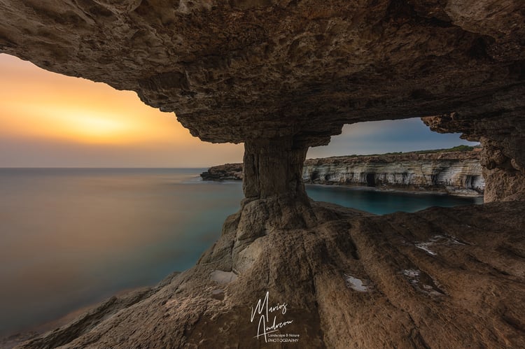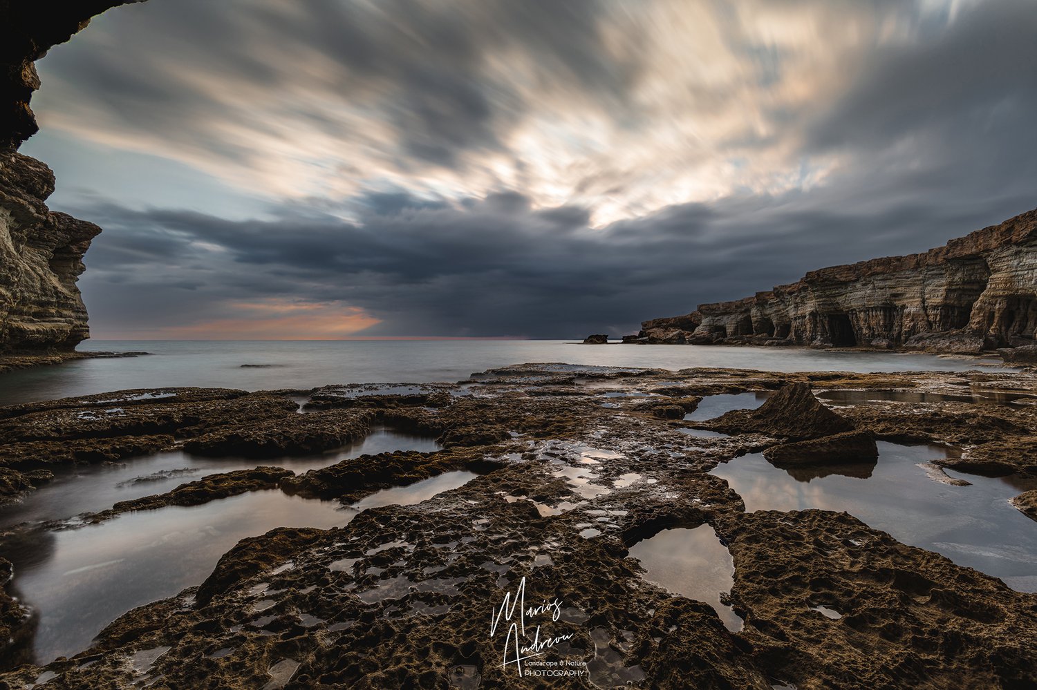 A dramatic moment captured in time, this long-exposure photograph of the iconic sea caves at Cape Greco, Cyprus, showcases nature in perfect balance. The photograph captures a breathtaking view of a sea cave, where the rugged, rocky shoreline dominates the foreground, its intricate textures and tide pools reflecting the dramatic, cloudy sky. The water is smoothed into a silky mist by the long exposure, creating a soft contrast to the harsh rock formations. In the midground, a stunning series of white, honeycombed cliffs with natural sea caves and arches line the shore, creating a sense of a hidden cove. The sky is filled with sweeping, fast-moving clouds blurred into dynamic streaks that emphasize the dramatic, stormy atmosphere, with a subtle light on the horizon adding a touch of warmth.