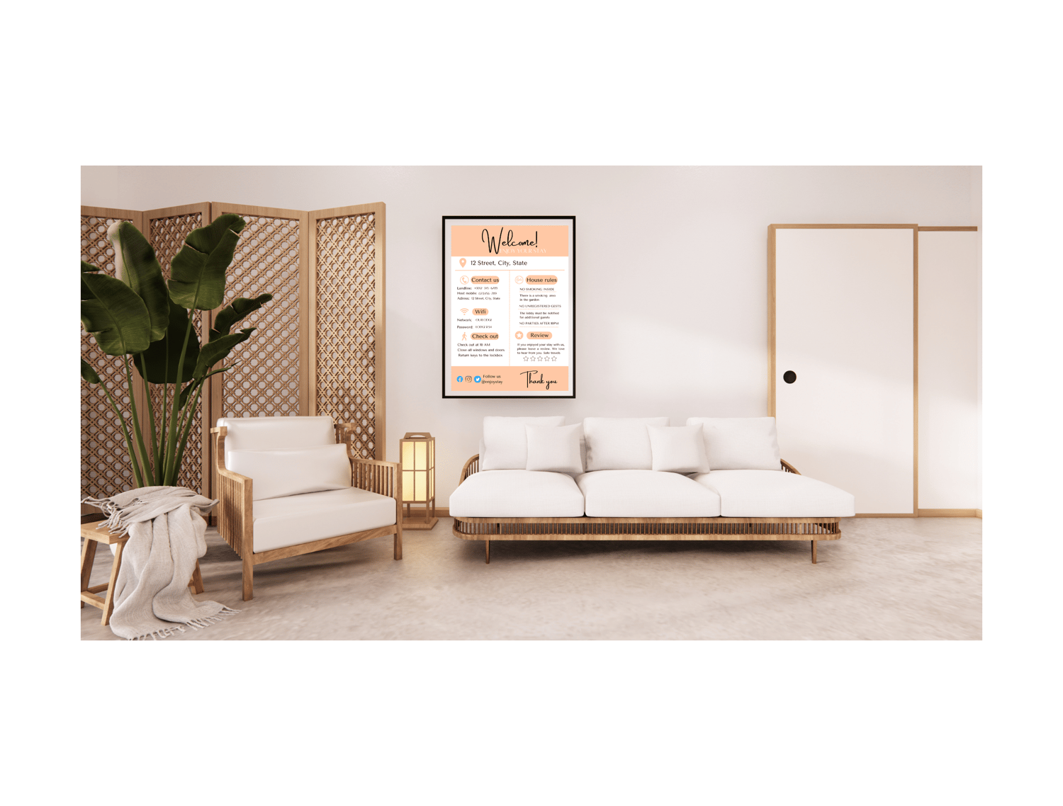 Our Welcome Sign is designed to make your guests feel comfortable and informed from the moment they arrive. With just a few simple steps, you can easily input essential information such as WIFI details and house rules on our sleek and modern Welcome Sign.