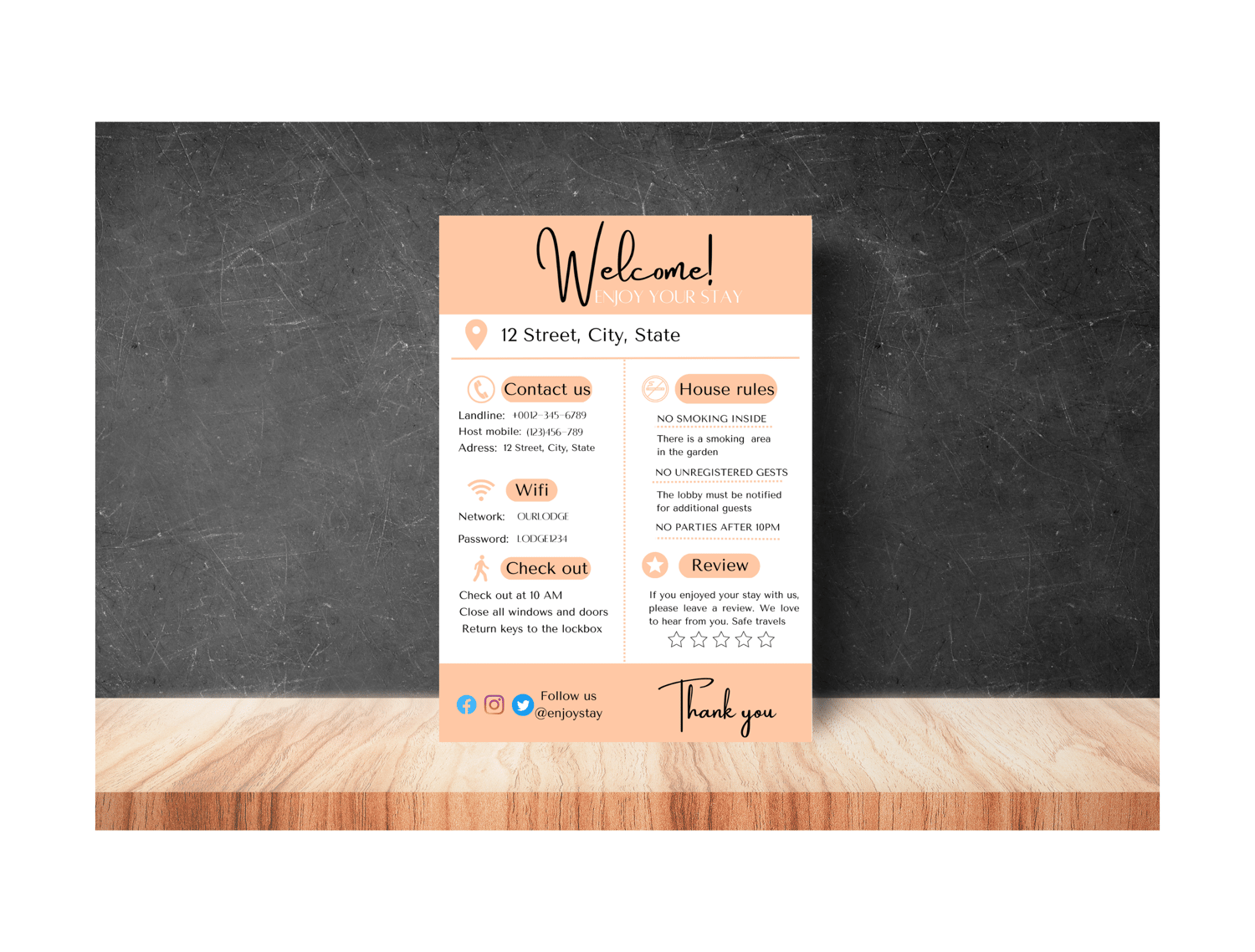 With our Welcome Sign, you can provide accessible information that your guests need, such as WIFI details and house rules, in a clear and concise way.