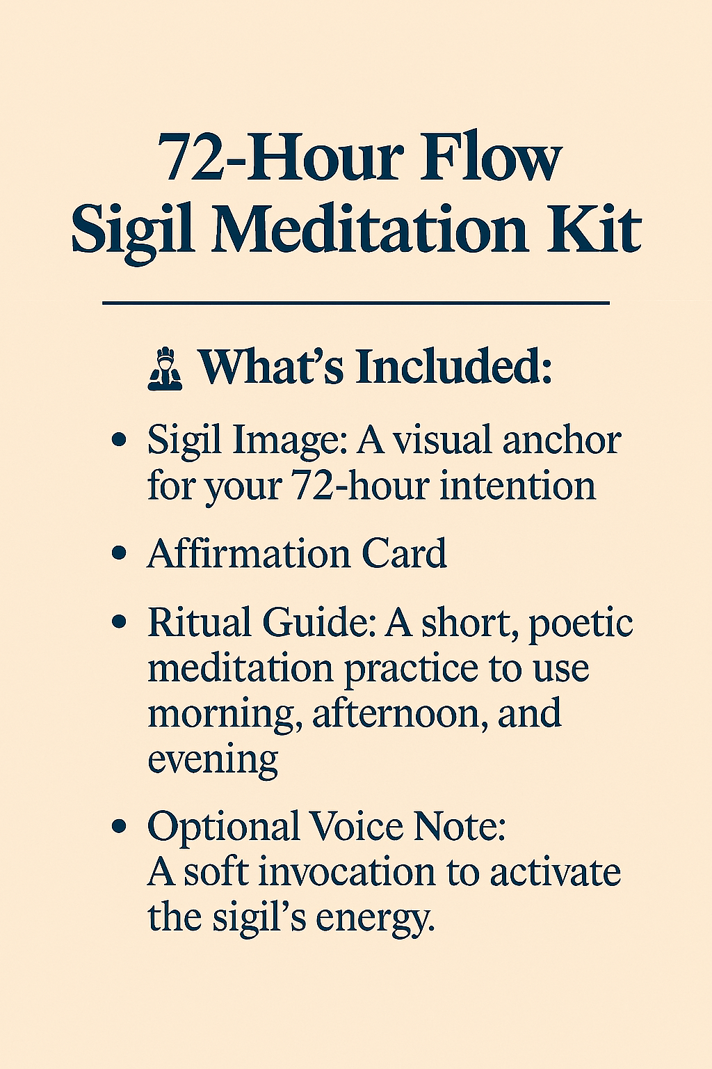 This multidimensional offering is designed for spiritual entrepreneurs, creatives, and truth-guides navigating emotional overwhelm, financial pressure, or energetic expansion. Rooted in the sacred number 72 (completion, structure, and intuitive grace), this kit invites you to meditate three times a day—morning, afternoon, and evening—with visual, poetic, and energetic support.
