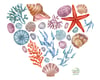 Saeshells heart. Under the sea. Ocean creatures. Corals, seashells, starfishes, pebbles, seaweed/alga