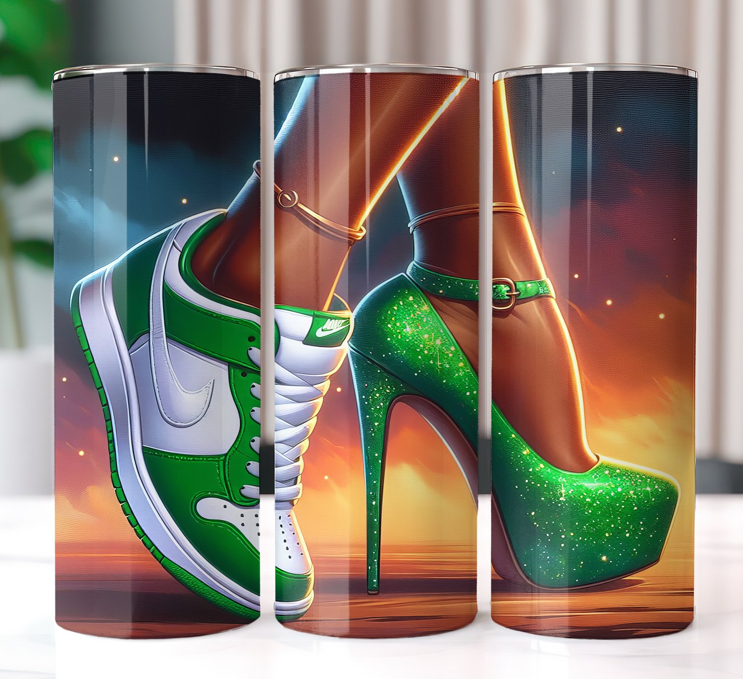This bold and glamorous tumbler design features a sparkling glitter stiletto on one side and a green sneaker on the other—perfect for the fashion-forward babe who rocks every step.