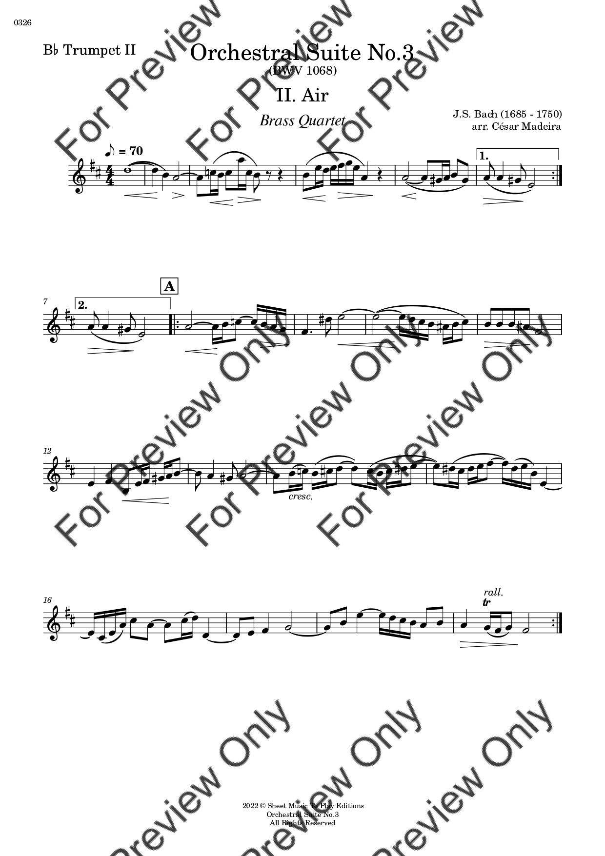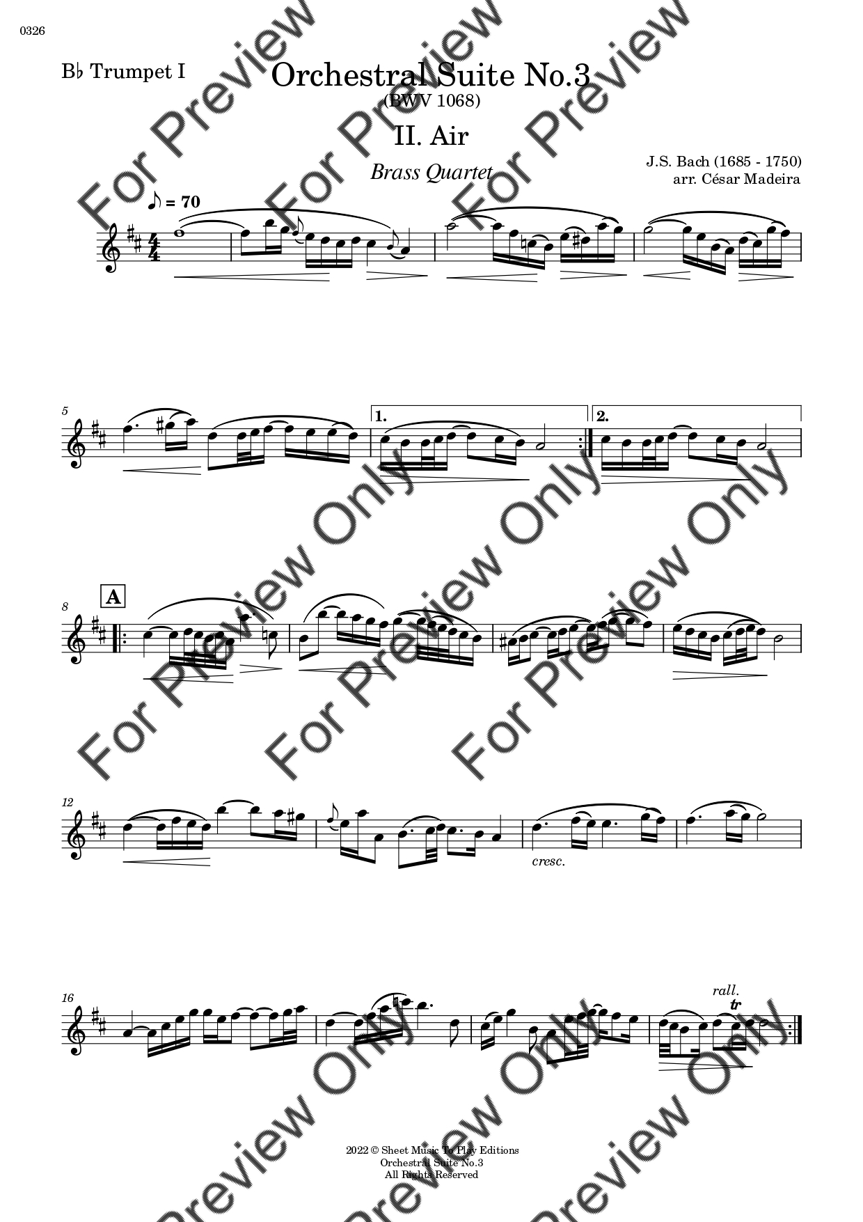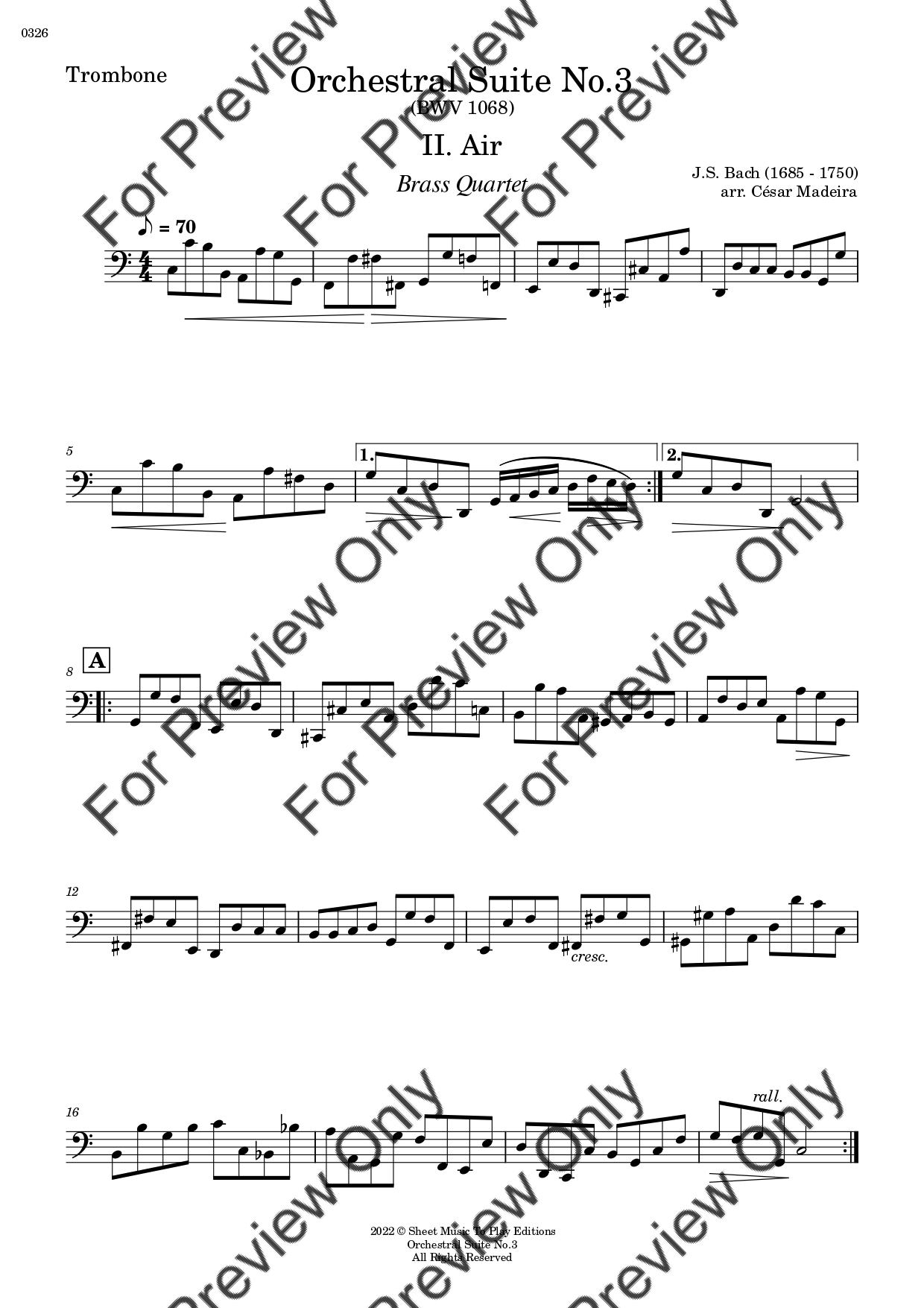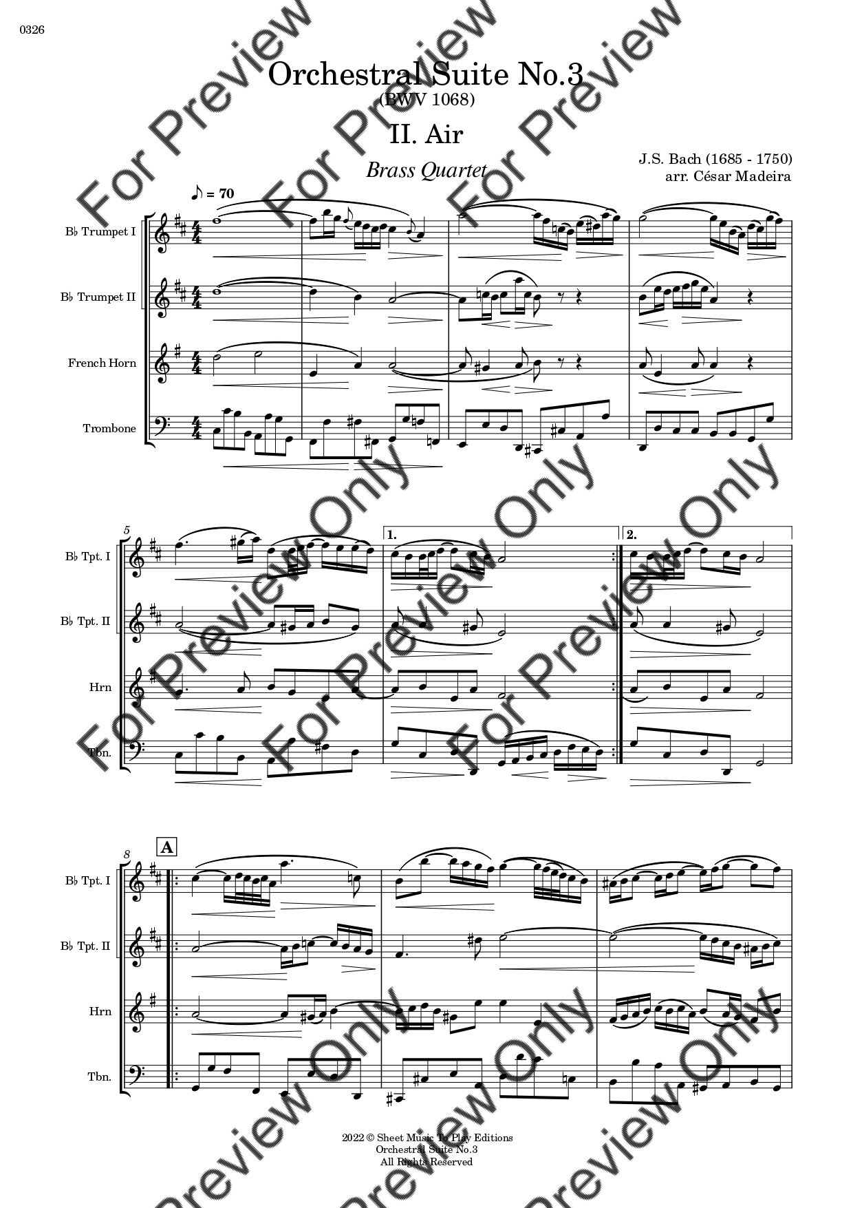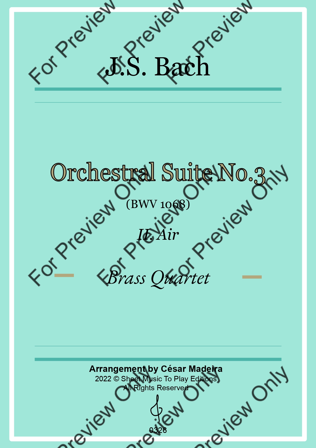 Air on G String by Johann Sebastian Bach. Arrangement for Brass Quartet - Bb Trumpet 1, 2, French Horn and Trombone. With Full Score and Individual Parts. Have fun!