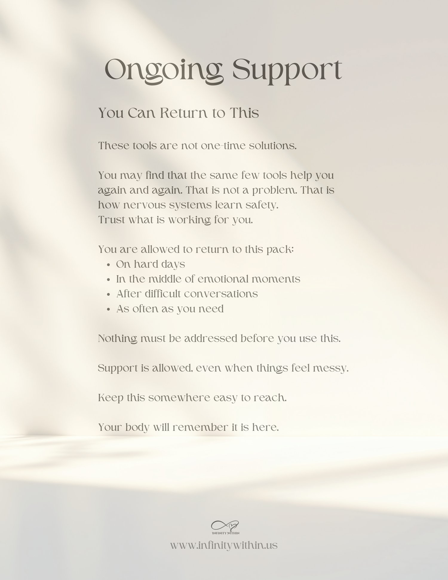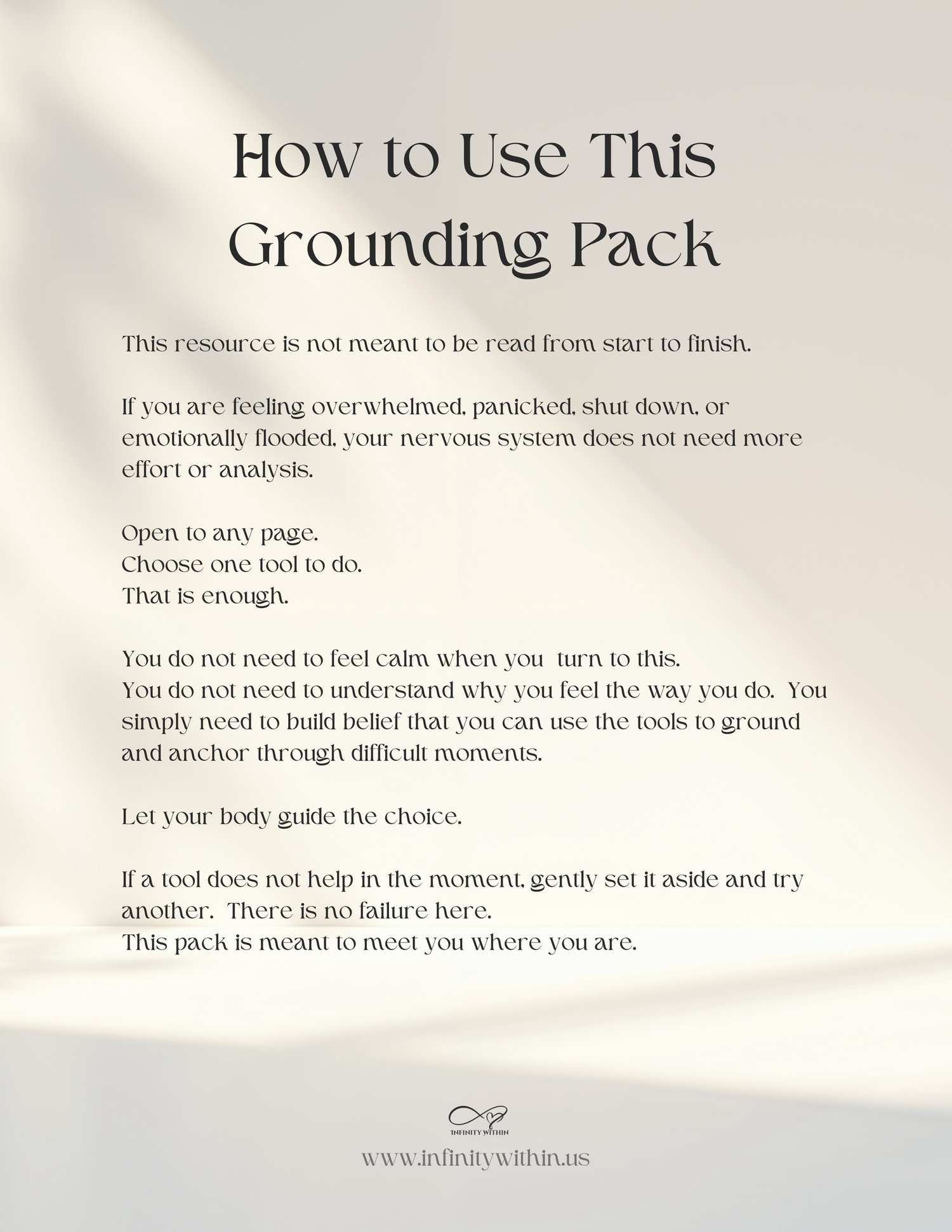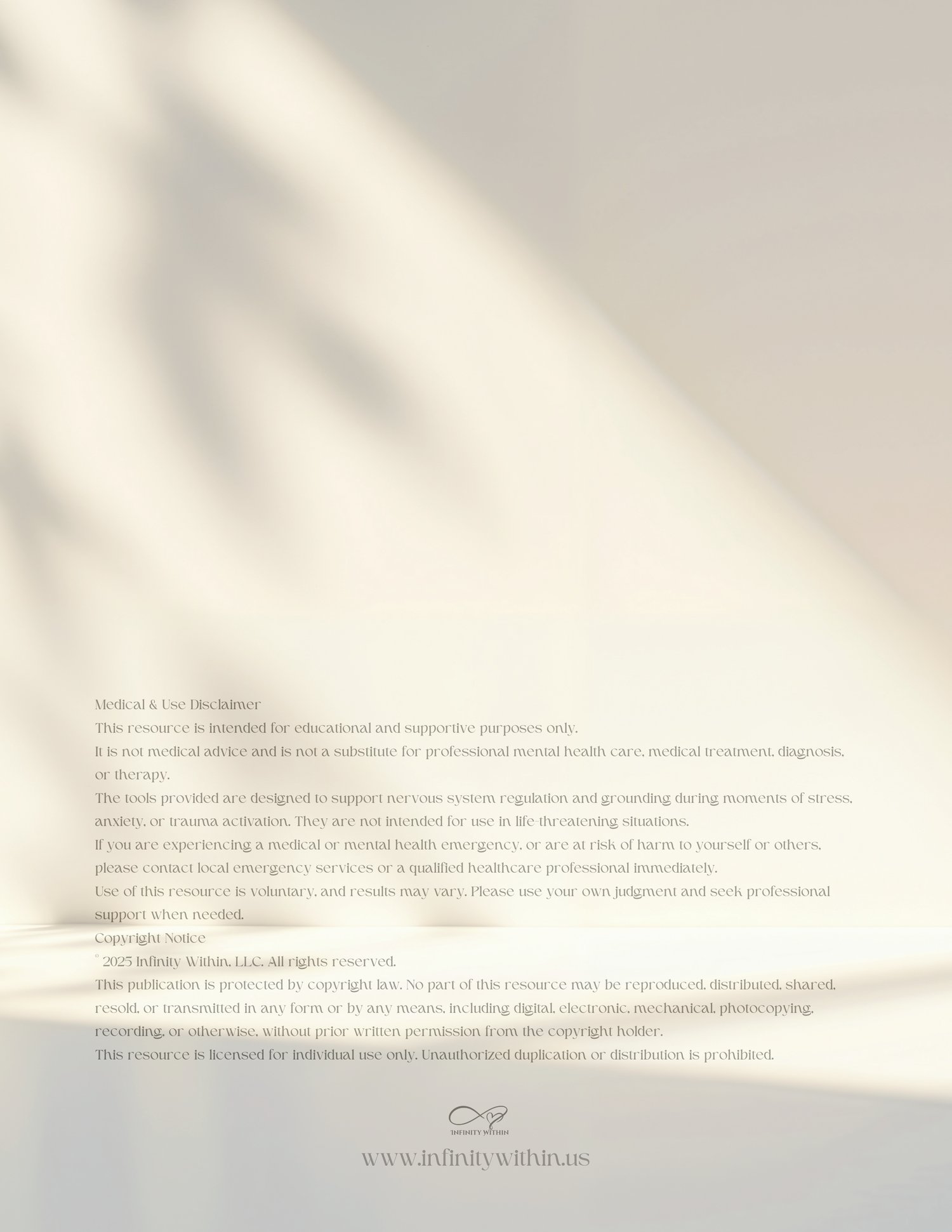 The tools provided are designed to support nervous system grounding and regulation during moments of stress, anxiety, or trauma activation. They are not intended for use in life-threatening situations.