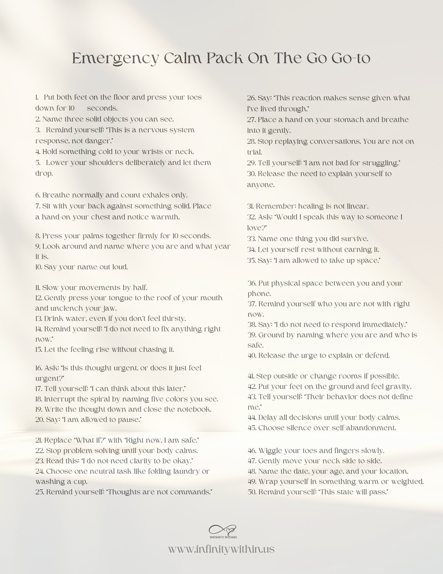 This is a practical, trauma-informed grounding pack designed to help you sustain an anxiety or PTSD wave without making it worse, in fact these are the same tools our founder has used in her journey with CPTSD.