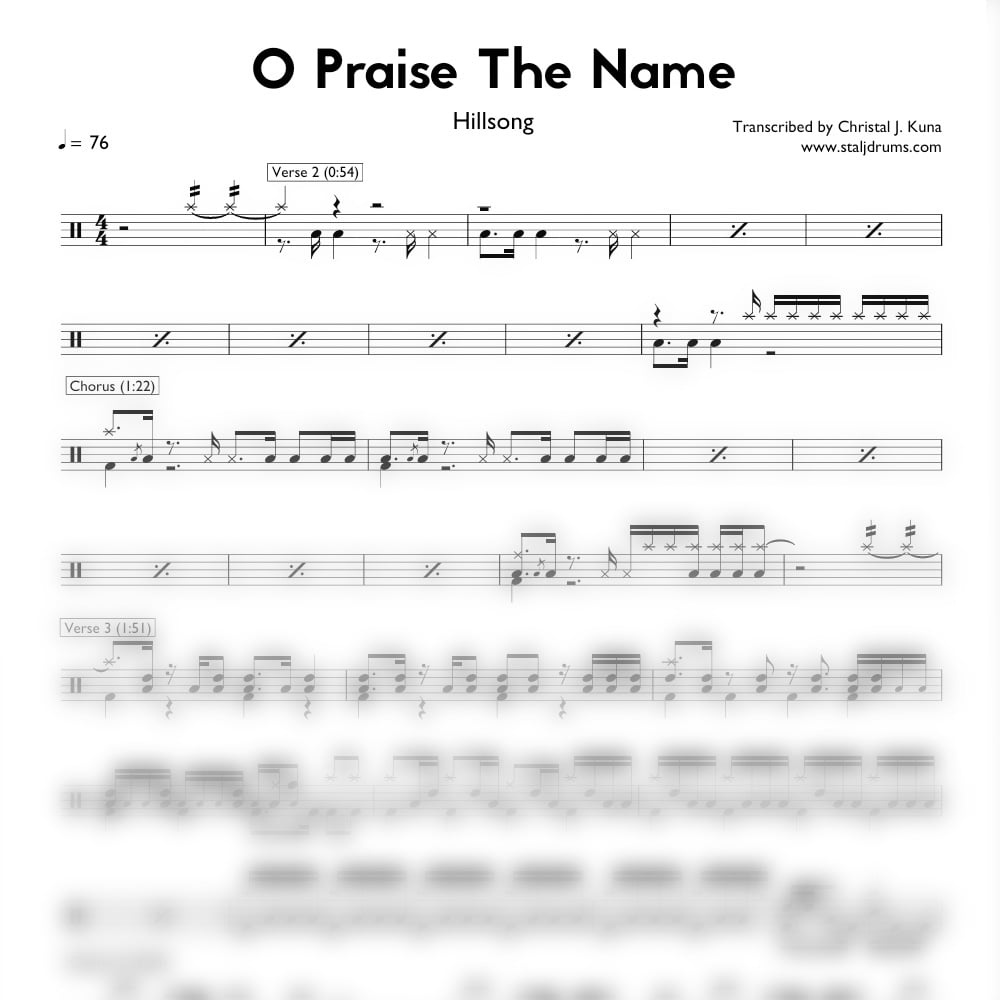 Drum sheet music for O Praise the Name (Anastasis) by Hillsong, formatted by section and with timestamps.