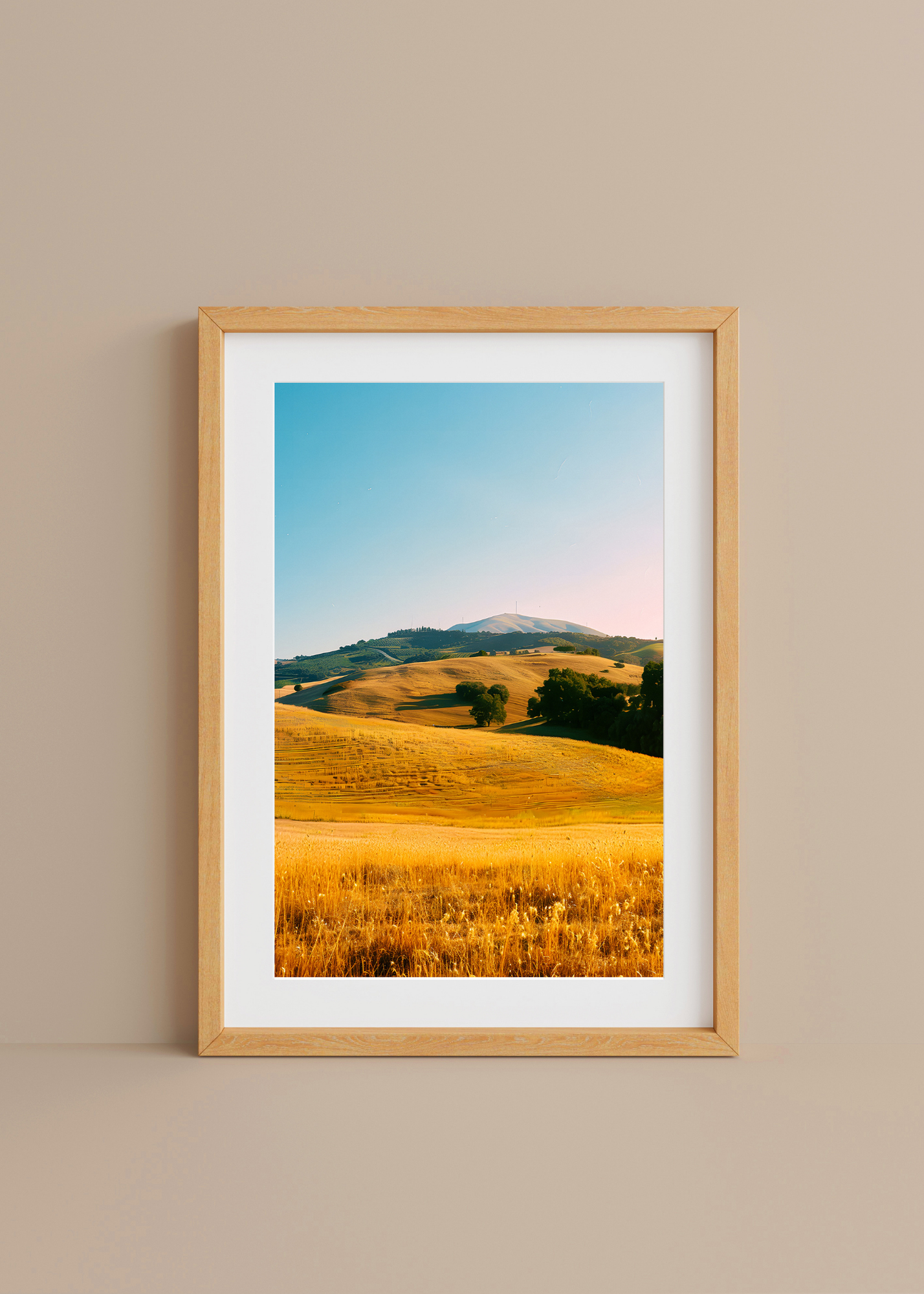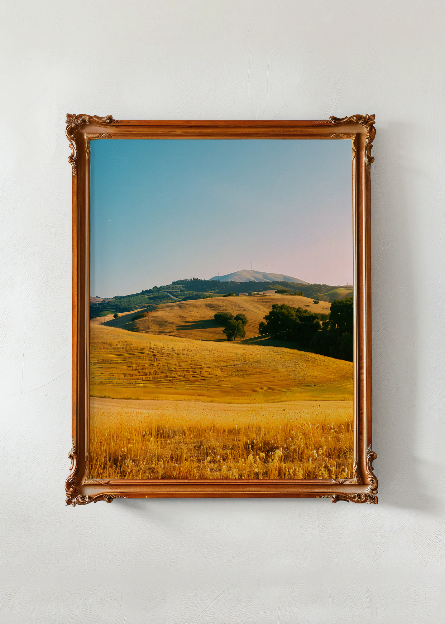 Fields of Quiet Gold— Waves of wheat stretch across sunlit hills, soft and endless beneath a sky so blue it aches. The land rolls and folds like a lullaby, dotted with trees and whispers of distant homes. It’s the kind of view that silences everything inside you. A place where the only to-do is to breathe. This print is pure countryside soul—warm, wide open, and woven with light.