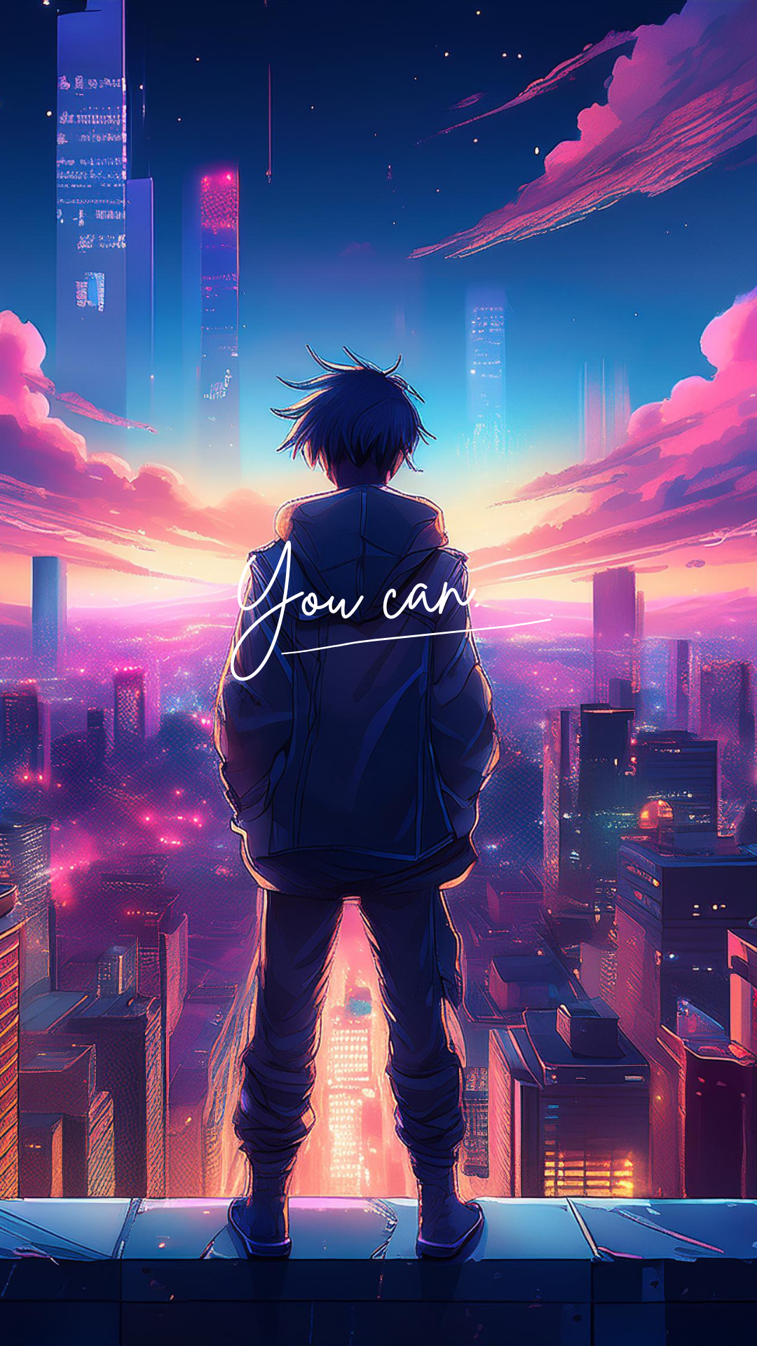 In conclusion, the image is a beautiful and thought-provoking depiction of a cityscape at sunset. It is a symbol of hope, inspiration, and the pursuit of dreams. The young man's solitary figure and the text "You Can" serve as a powerful reminder that with determination and perseverance, anything is possible. The image's vibrant colors and dramatic composition create a lasting impression that will resonate with viewers of all ages.