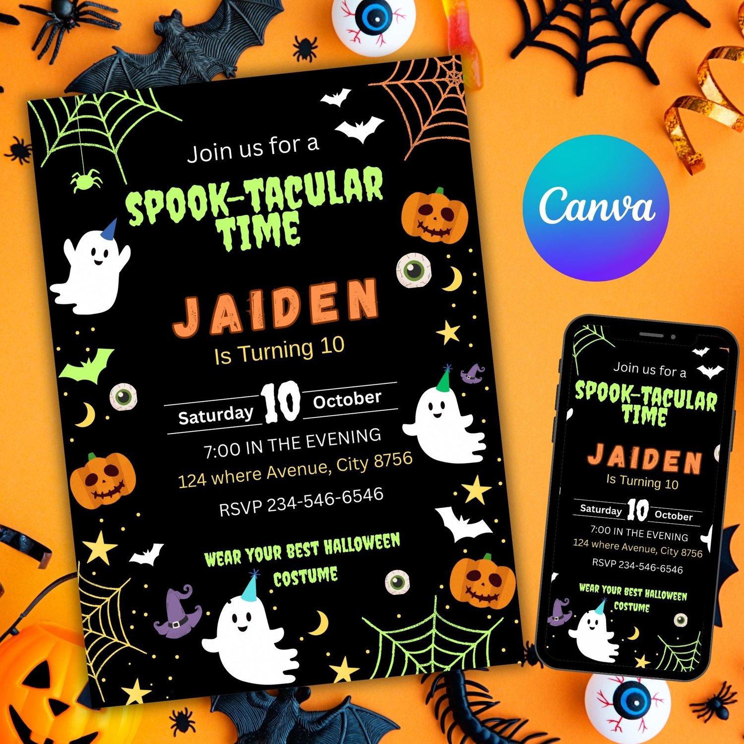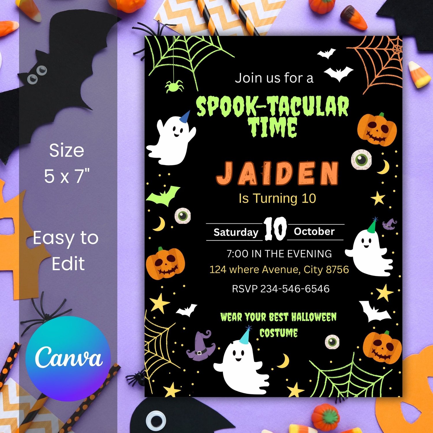 Celebrate your little one’s birthday with this spooky and fun Halloween invitation! Perfect for kids’ parties, this editable template lets you easily personalize the text using Canva – no special software needed. • 5x7 inches (standard invitation size)
