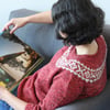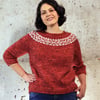 The sweater is knit top down in the round with short rows at the neckline and hem for shaping. Sleeves are knit straight to the cuff, then gathered.