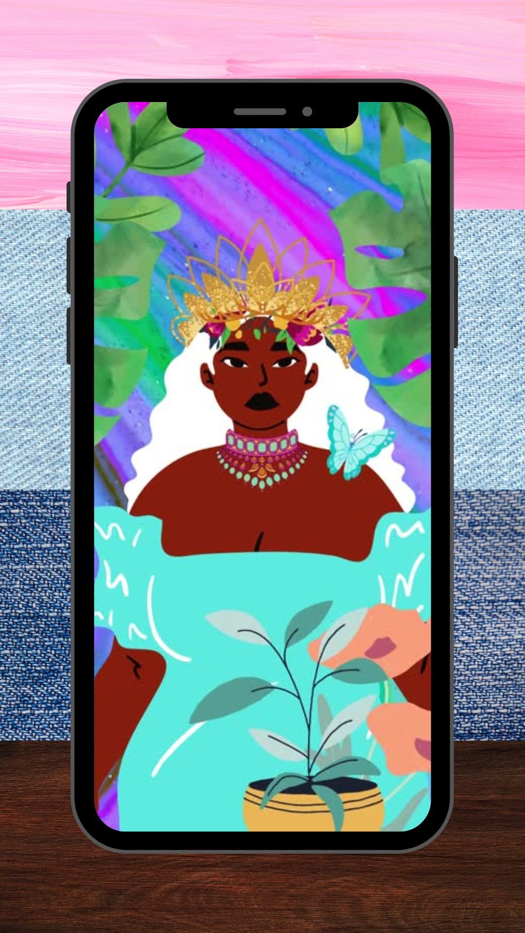 Vibrant animated illustration of a beautiful brown Goddess wearing a golden crown with a background of a colorful galactic sky with flowers.