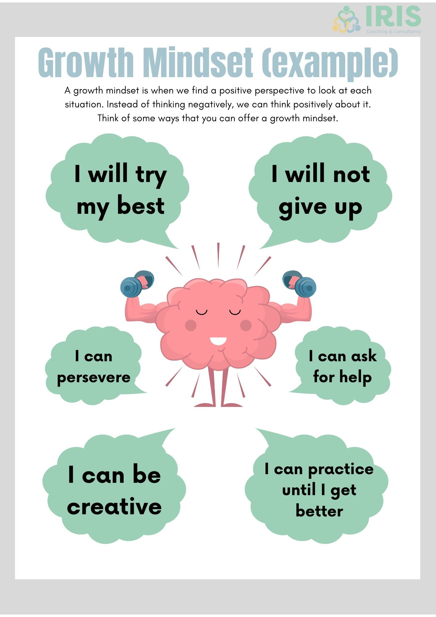A growth mindset is when we find a positive perspective to look at each situation. Instead of thinking negatively, we can think positively about it. Think of some ways that you can offer a growth mindset - a great resource to help you think positively and keep motivated!
