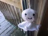 This listing is a pattern for a teru teru bozu. One size only. The sample pictured is made from worsted weight yarn in white; pink and black embroidery floss; black safety eyes; and polyfill.
