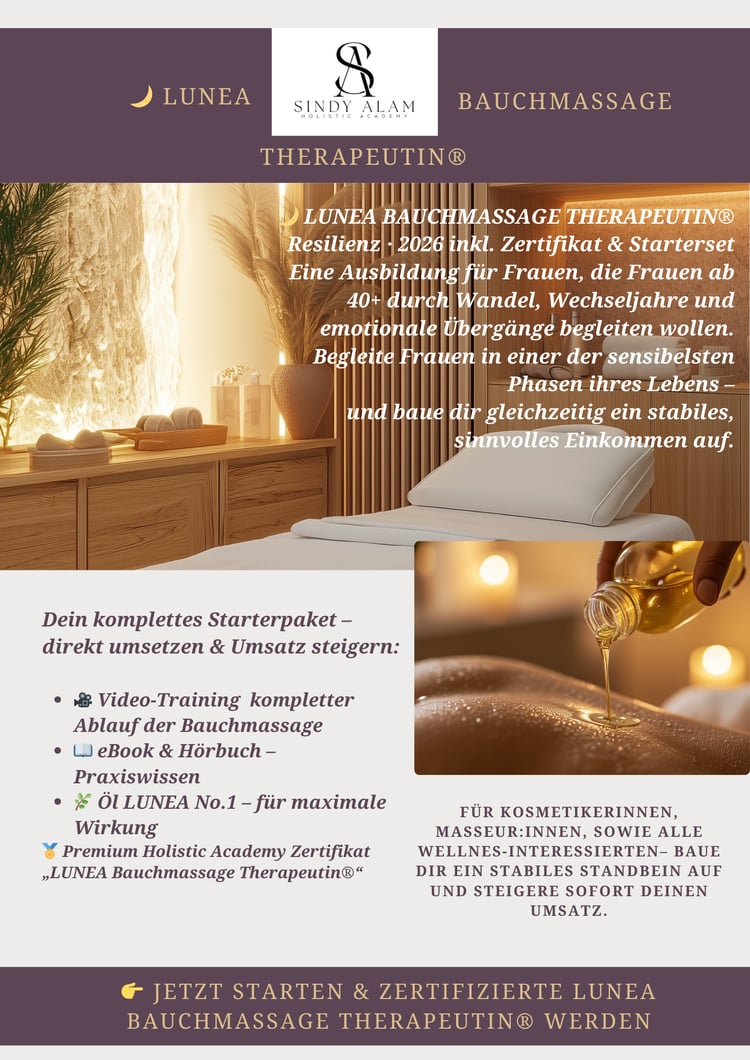Als Sindy Alam Signature Healing Practitioner erlernst du eine Methode, die es nur hier gibt – eine Kombination aus meiner selbst entwickelten Signature‑Massage, kraftvoller Klangschalen-Thearpie und hochschwingender Frequenzarbeit.