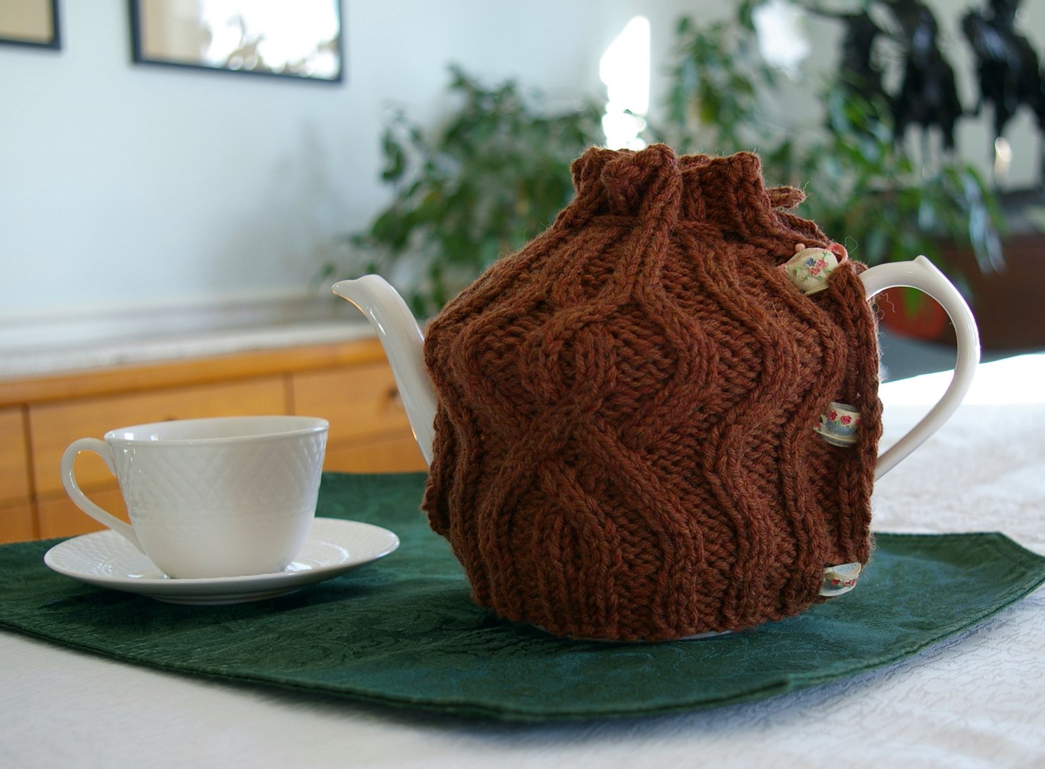 This cozy has a bit of whimsy and a bit of seriousness – just right for keeping your tea warm over a cozy afternoon. The cables are inspired by steam wafting up from a teacup, sometimes overlapping in a bit of a breeze.