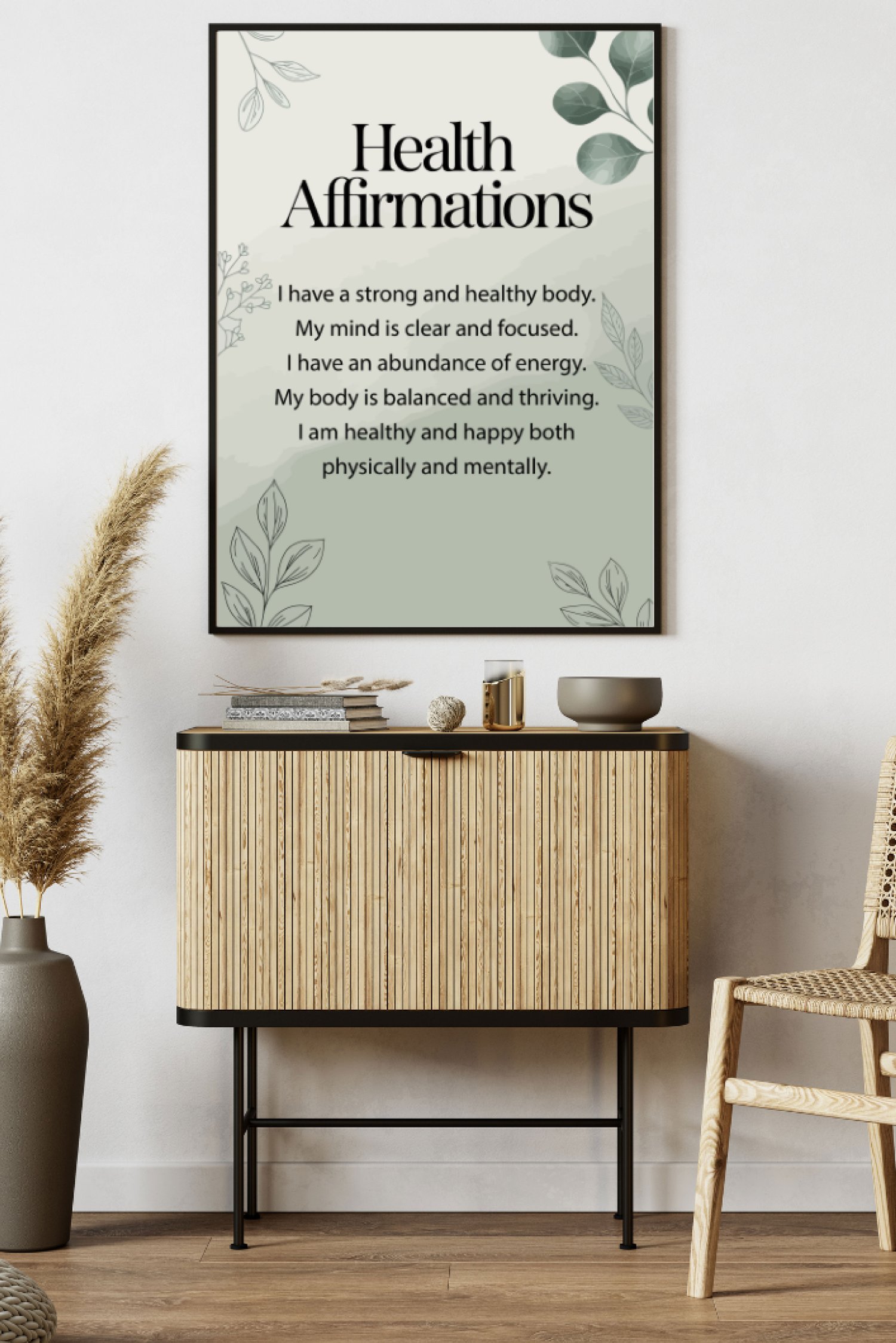 Health Affirmations Printable — Sage Green Botanical Wellness Wall Art, Mindfulness Decor, Instant Digital Download (PNG, 7 Sizes) | WellnessHub