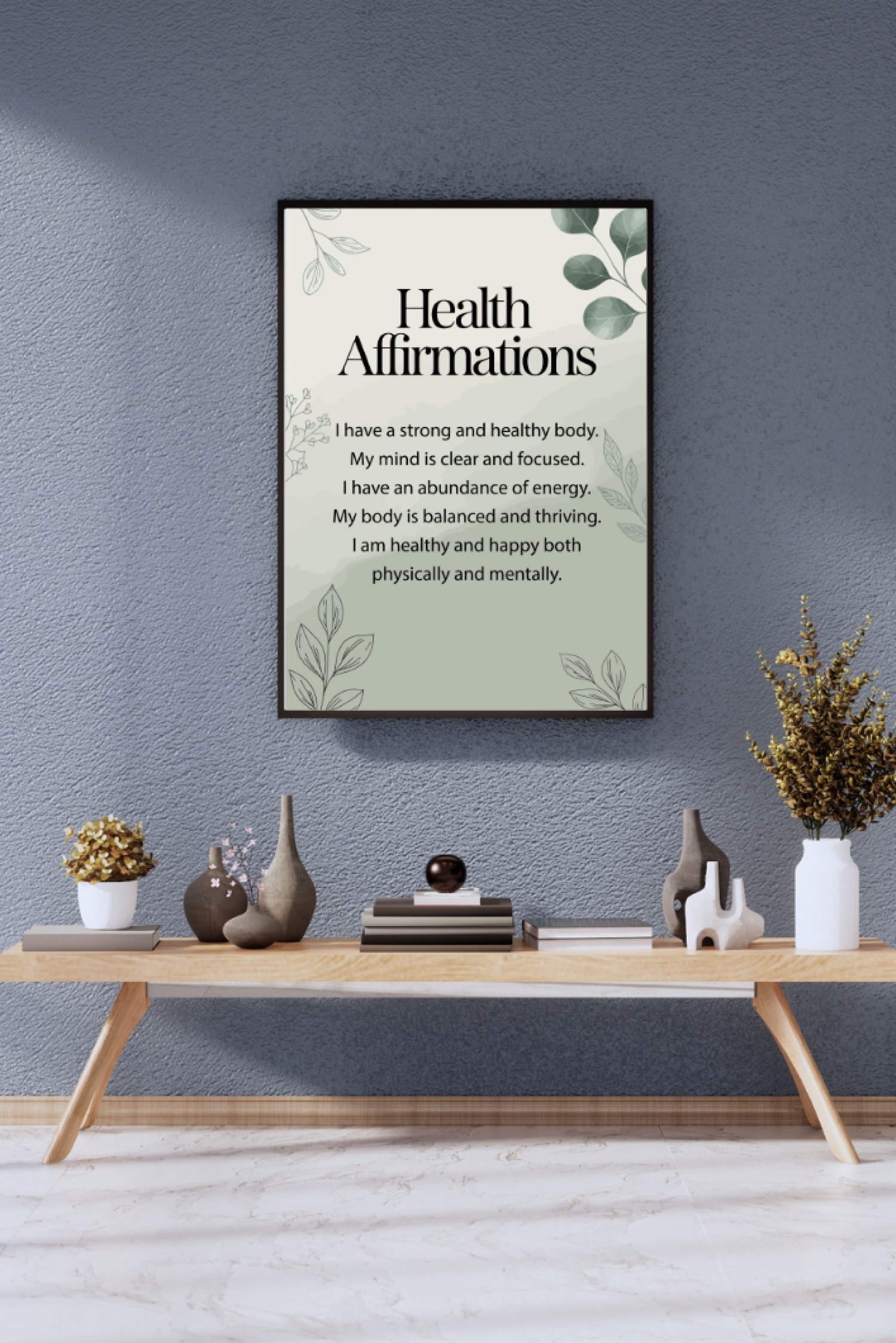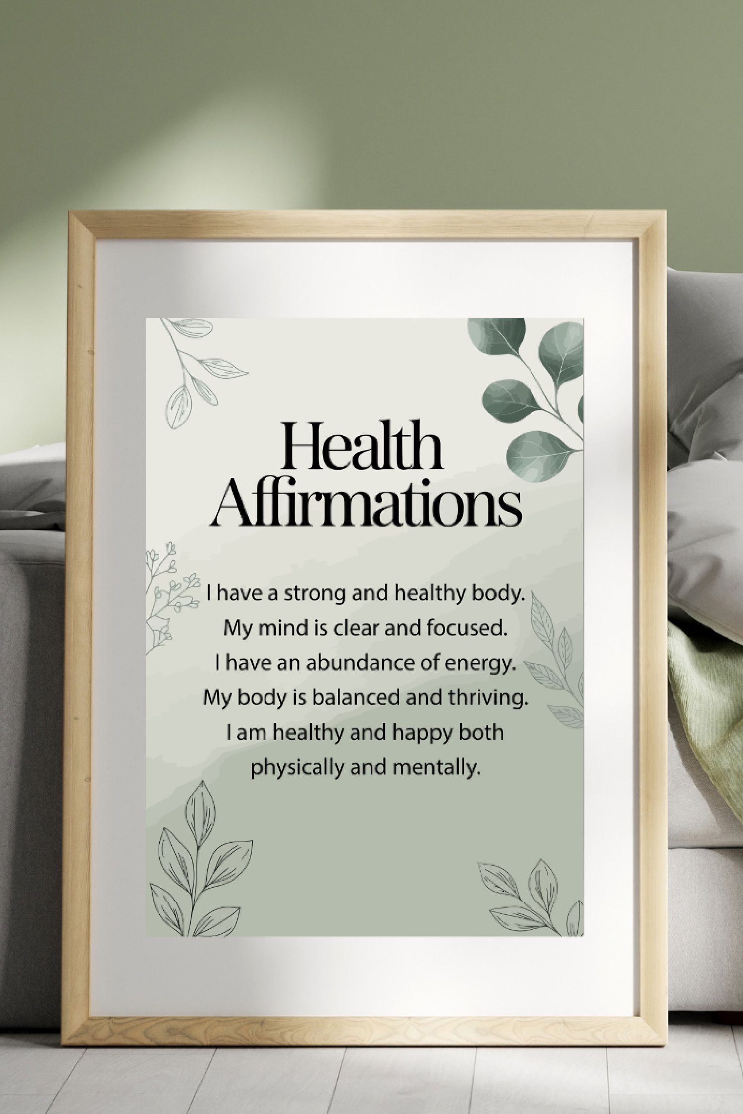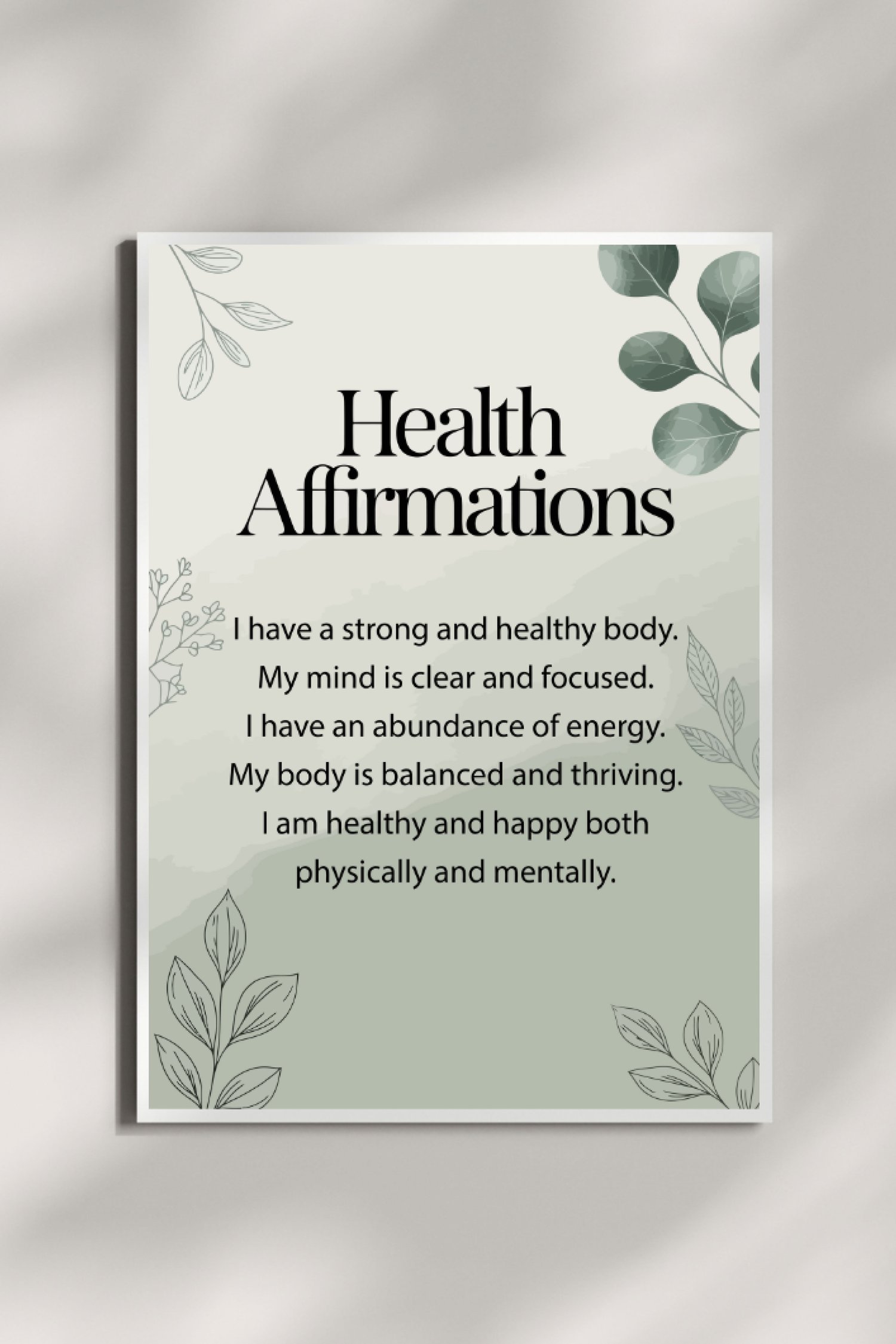 Bring gentle motivation to your space with this modern botanical print featuring uplifting health affirmations on a soothing sage gradient with leafy line art. Perfect for bedrooms, therapy offices, yoga/meditation corners, home gyms, classrooms, and wellness studios.
