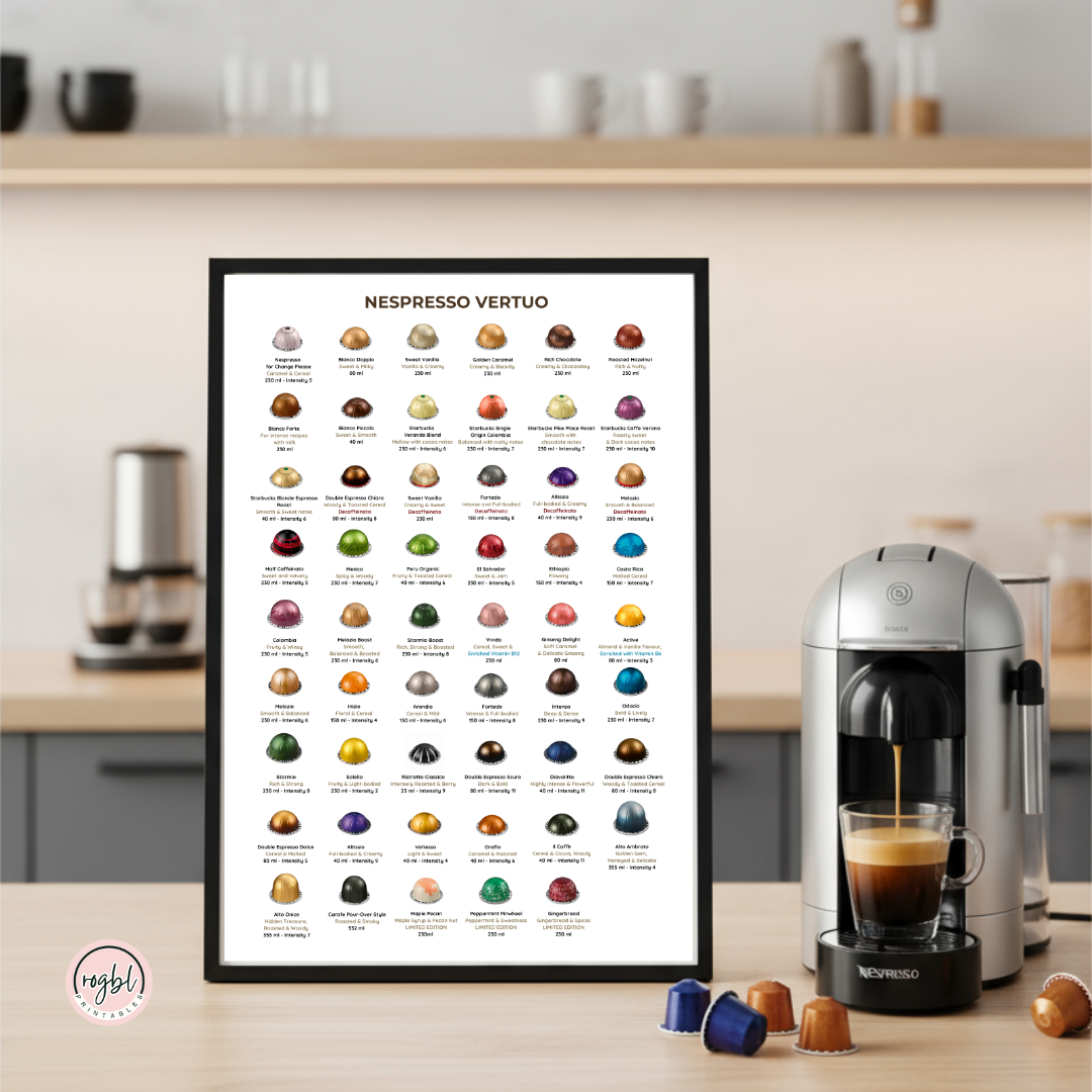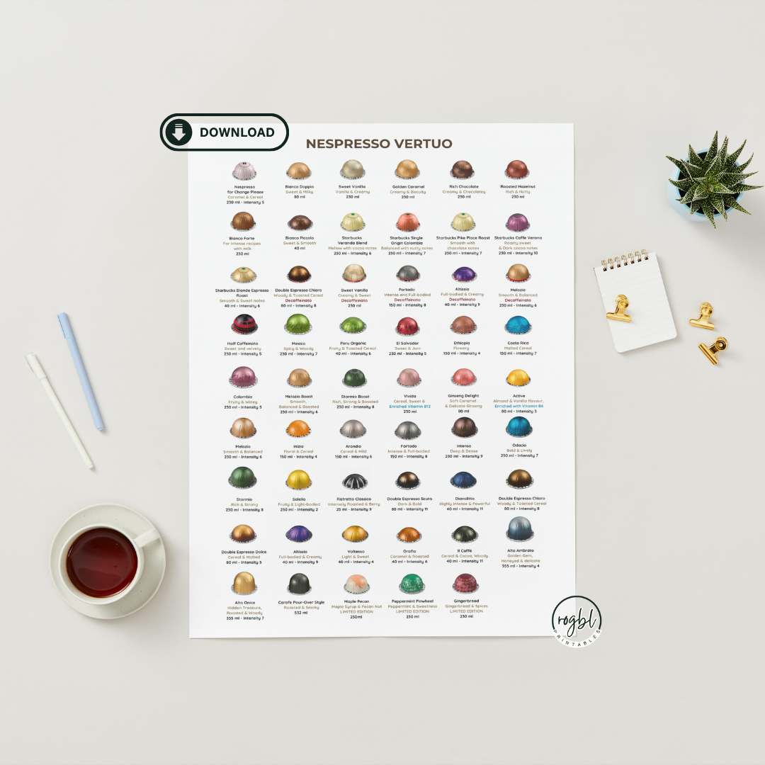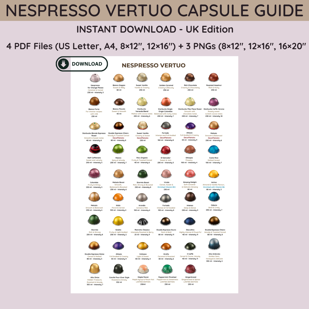 Nespresso Vertuo Guide UK – Printable Coffee Capsule Menu, Intensity & Flavour, Updated Nov 2025, Digital Download PDF + PNG