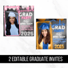 Celebrate your graduate’s milestone in style with this bundle of 2 editable Graduation Invitation templates! Designed for effortless customization in Canva, these templates allow you to personalize the graduate’s name, photo, event details, and school colors in just a few clicks. Whether you're hosting a graduation party or sending out formal announcements, these stylish designs will make your celebration unforgettable!