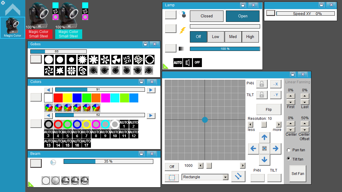 * Verifique, con un Fixture de pruebas (click), que coincidan estos canales: 6 Dimmer, 8 en el valor 91 = Color Celeste, 10 Prisma, 9 en el valor 65 = Gobo de la tercer foto.