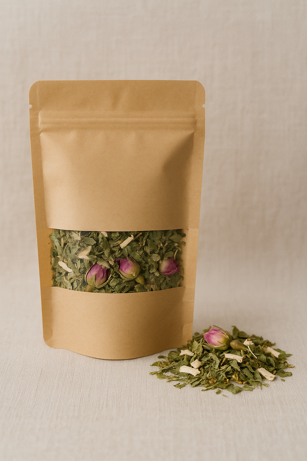 Ingredients: Lemon balm, catnip, rose buds & petals, marshmallow, damiana, raspberry leaf