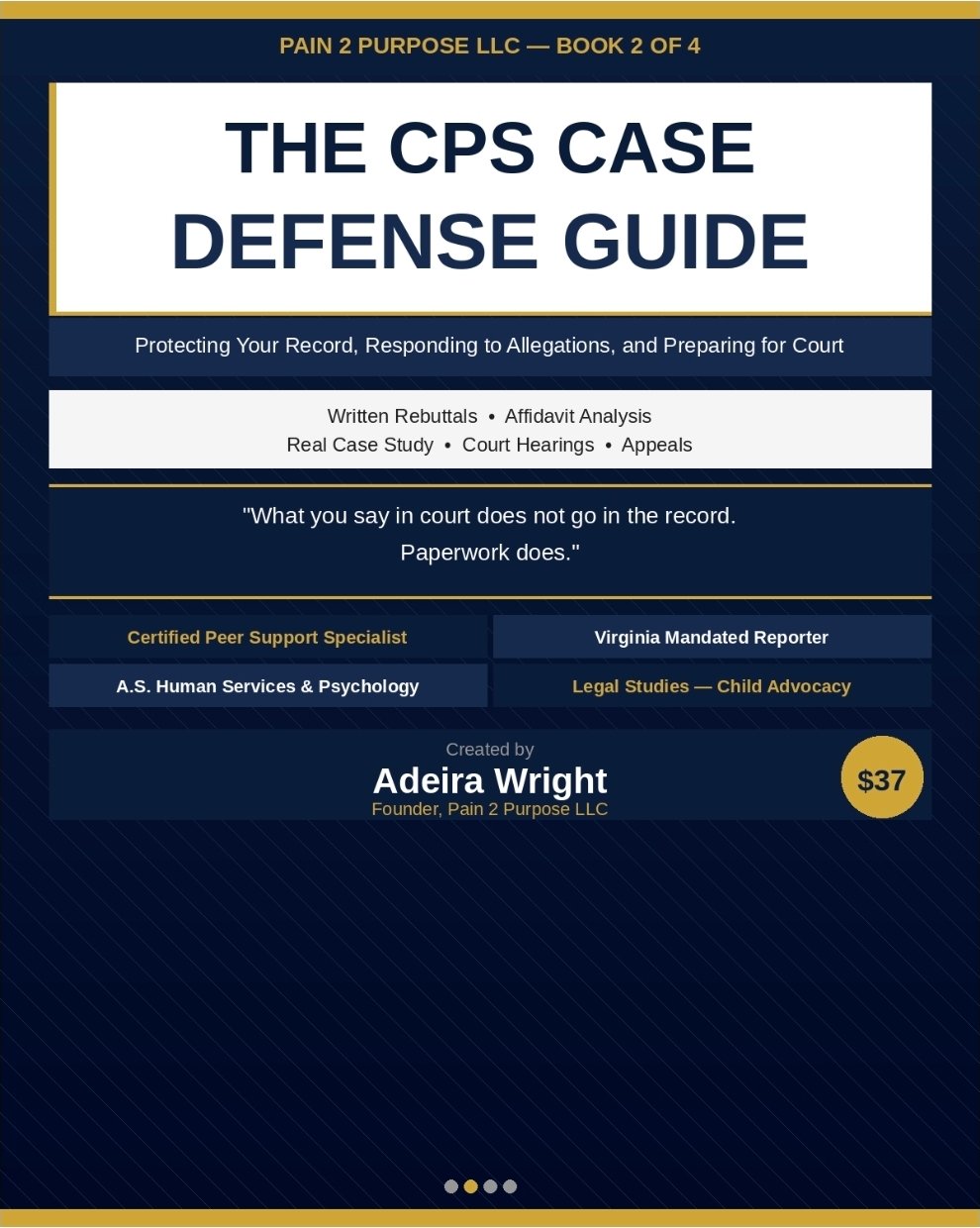 THE CPS CASE DEFENSE GUIDE — Book 2 of the Pain 2 Purpose Series is an 85-page practical strategy manual for parents who are already in a case with the child welfare agency. Written by Adeira Wright, Certified Peer Support Specialist and founder of Pain 2 Purpose LLC, using strategies she developed across two real cases — one she lost and one she won.