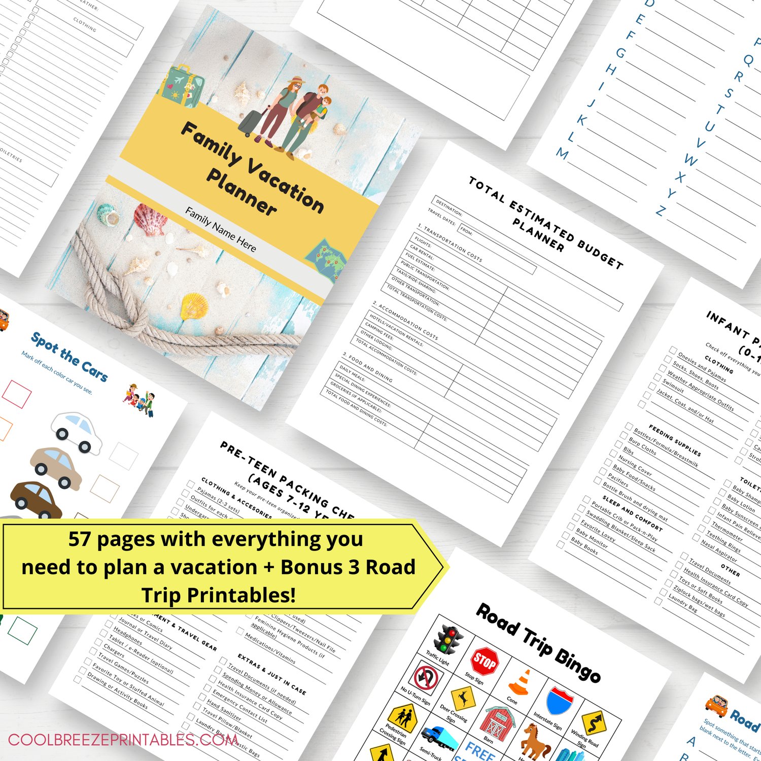 This pack includes 60 fully editable templates like travel planner pages, age specific packing lists, printable road trip games, and more! Perfect for creating your own line of family vacation printables to sell or offer as lead magnets.