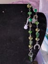 Handcrafted pendulum with dark green glass pendulum point, lucky Horseshoe charm, guitar charm, and pot leaf charm. Each pendulum is a one-of-a-kind creation hand crafted to create a unique and special look.