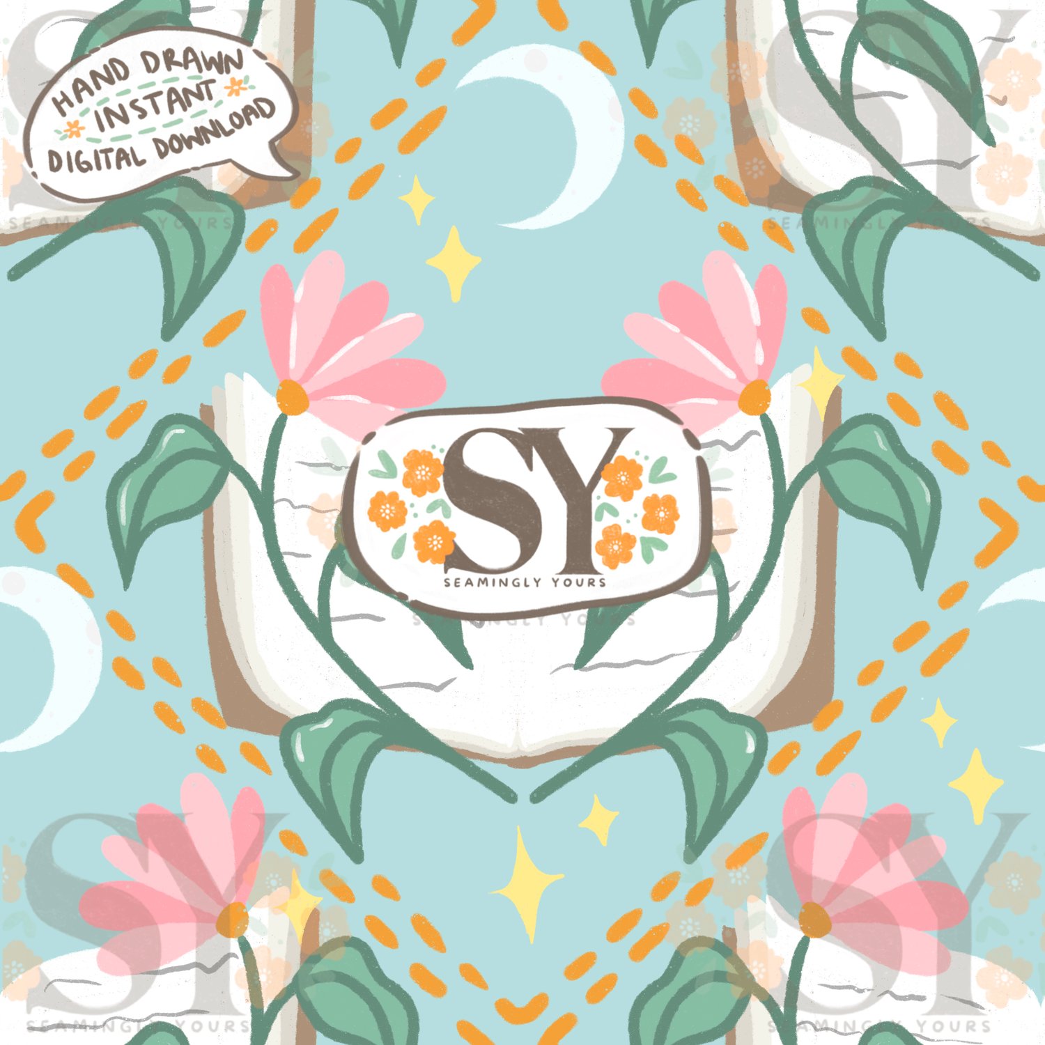 Moonlight Floral Open Book Teal Print | Hand-drawn Seamless Pattern | Digital Download for Crafts & Sublimation | Commercial Use for Small Business
