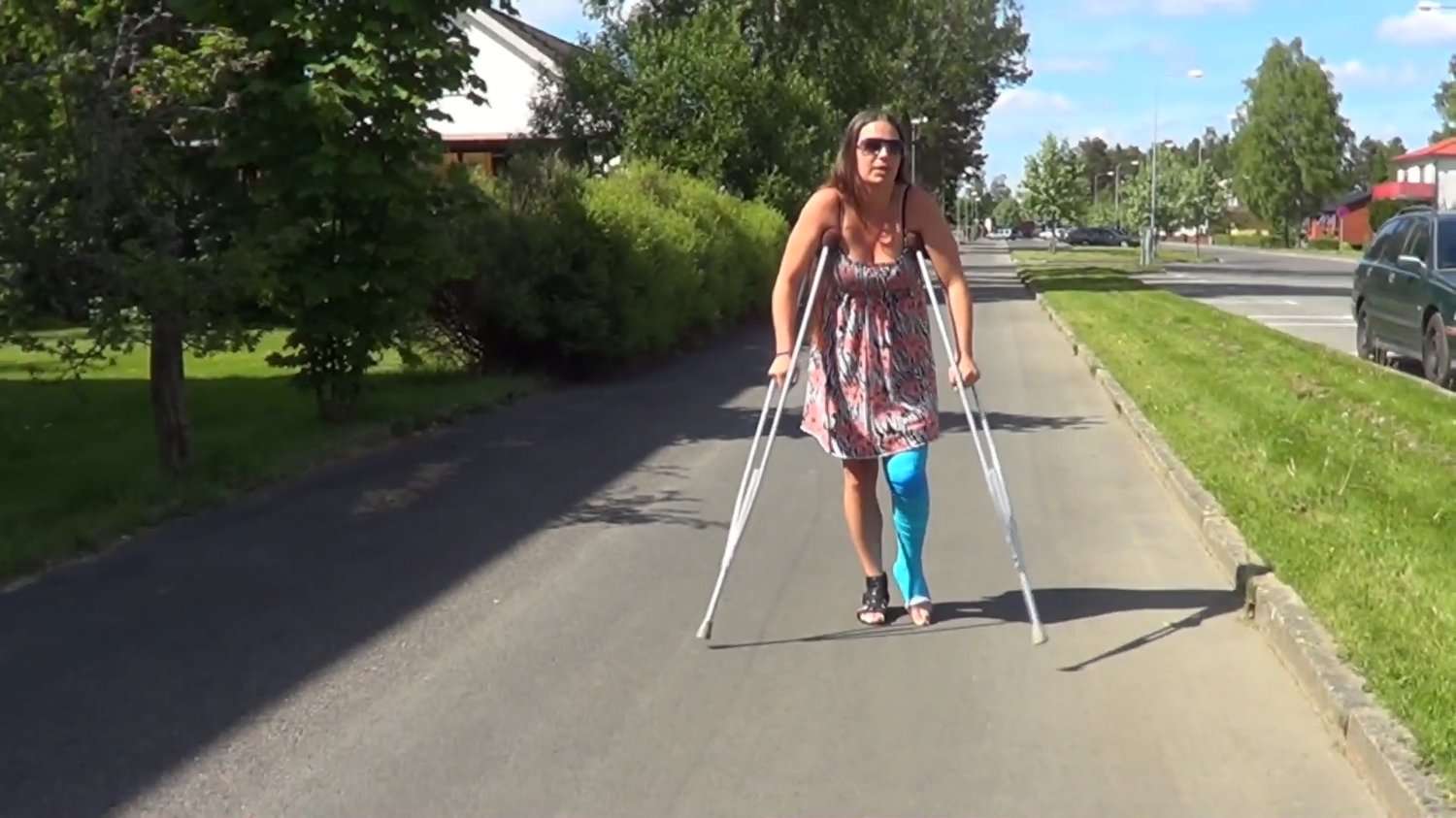 Sandy is on ger way home with her LLC and underarm crutches. On the way she stops on a playground to play with a swing