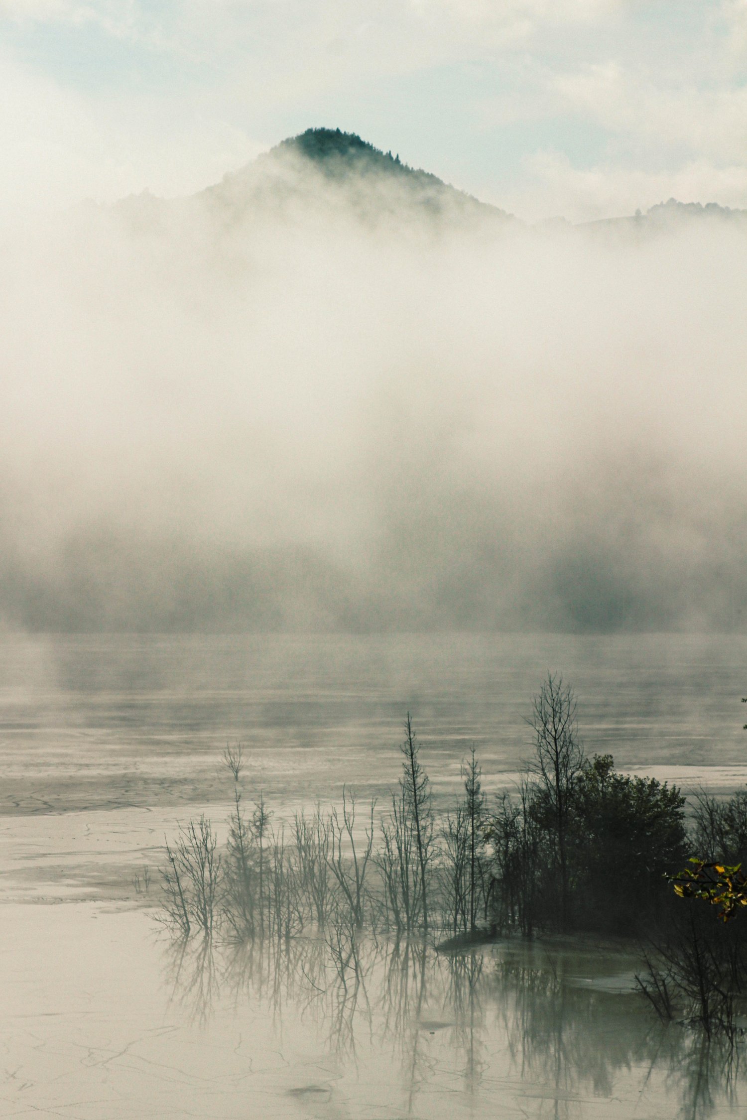 J’ai pris cette photo au cœur d’une quête étrange : retrouver le clocher d’un village englouti dont un habitant m’avait parlé. Toute la matinée, la brume avait recouvert le lac et ses rives comme un secret. Puis, soudain, elle s’est levée. Devant moi, le lac est apparu, avec ces arbres qui semblaient vouloir s’échapper de l’eau, et ce sommet qui flottait au-dessus de la mer de nuages comme une île céleste. Sous cette eau boueuse reposait le village que je cherchais, invisible mais présent, ajoutant à la scène un mystère presque sacré.