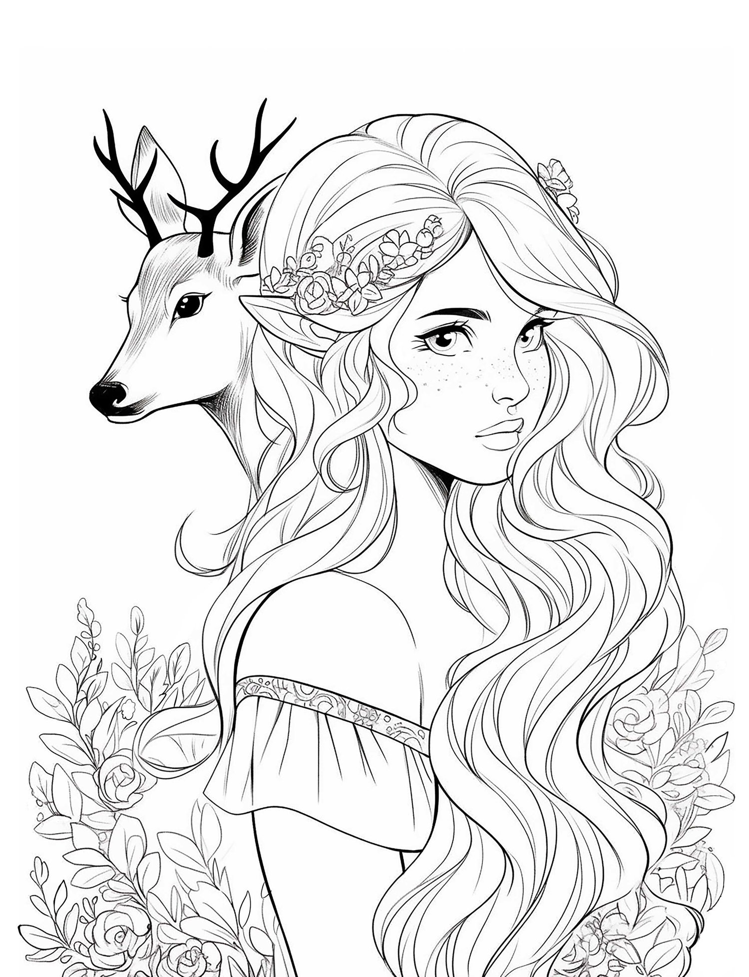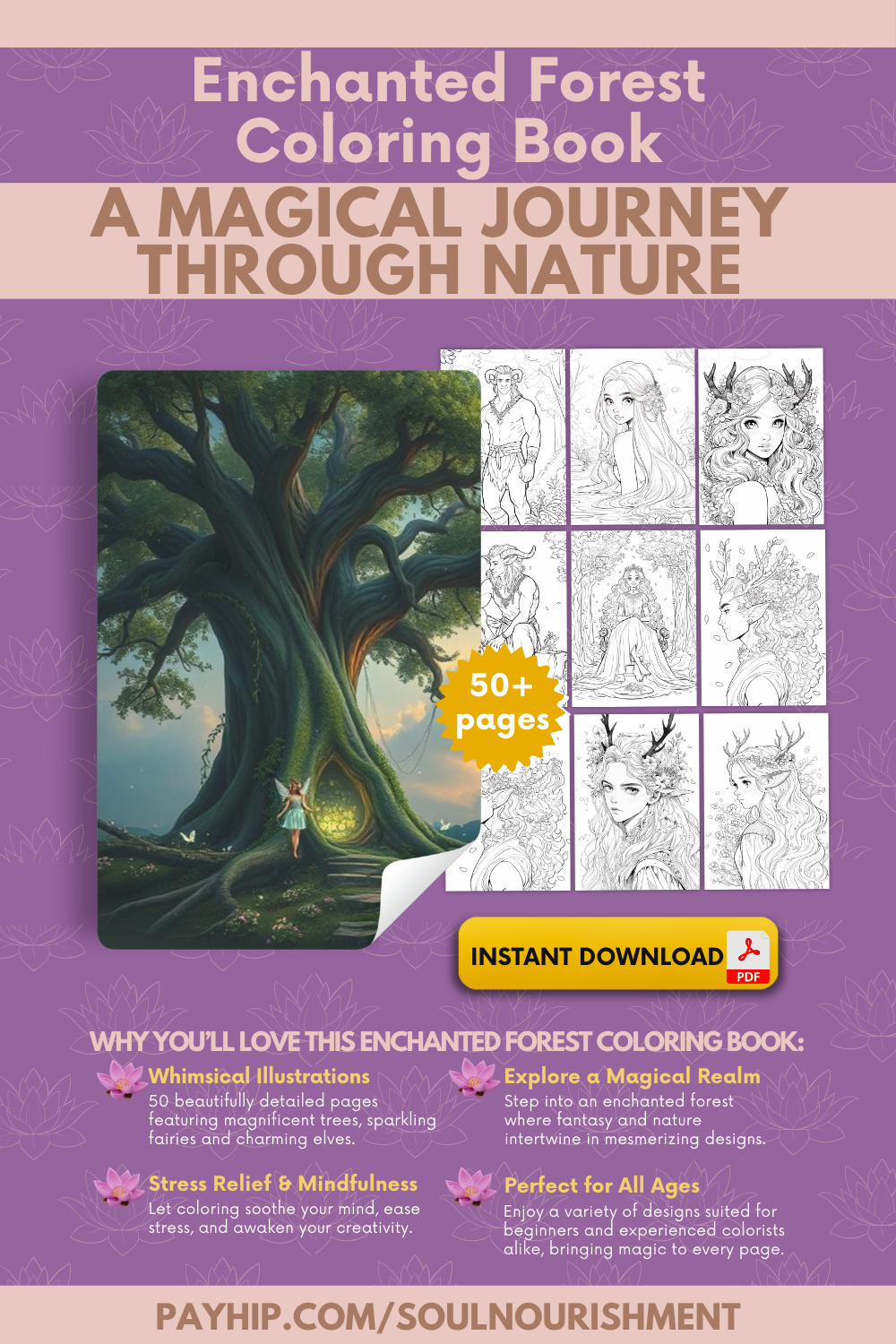 - 50 Magical Pages: A delightful collection of enchanting illustrations featuring elves, fairies, magical creatures, and the serene beauty of nature, each waiting for vibrant hues.