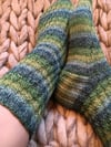 Envy is a top-down sock that features a shifting rib pattern. The rib jumps to the right every few rows. The adjective “the grass is greener on the other side” definitely applies to these socks. The stitches almost seem to be jealous of one another and therefore keep jumping to the other, greener grass.