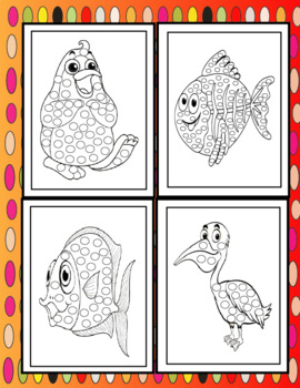 sea animals: sea animals appear throughout the book. It’s also a lot of fun to color sea animals with dot markers!