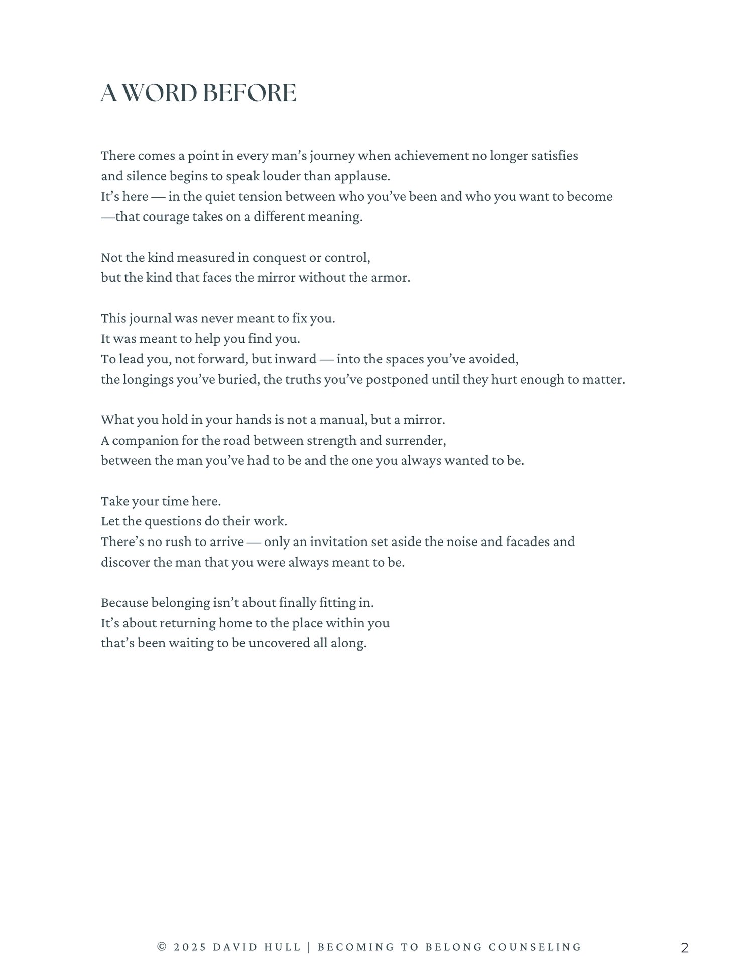 The Courage to Belong is a guided journal for men ready to trade performance for presence and rediscover who they are beneath the roles, expectations, and noise.