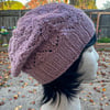 ConstructionWorked in the round, bottom up, increasing after ribbing, then decreasing for the crown after several repeats of the lace pattern.