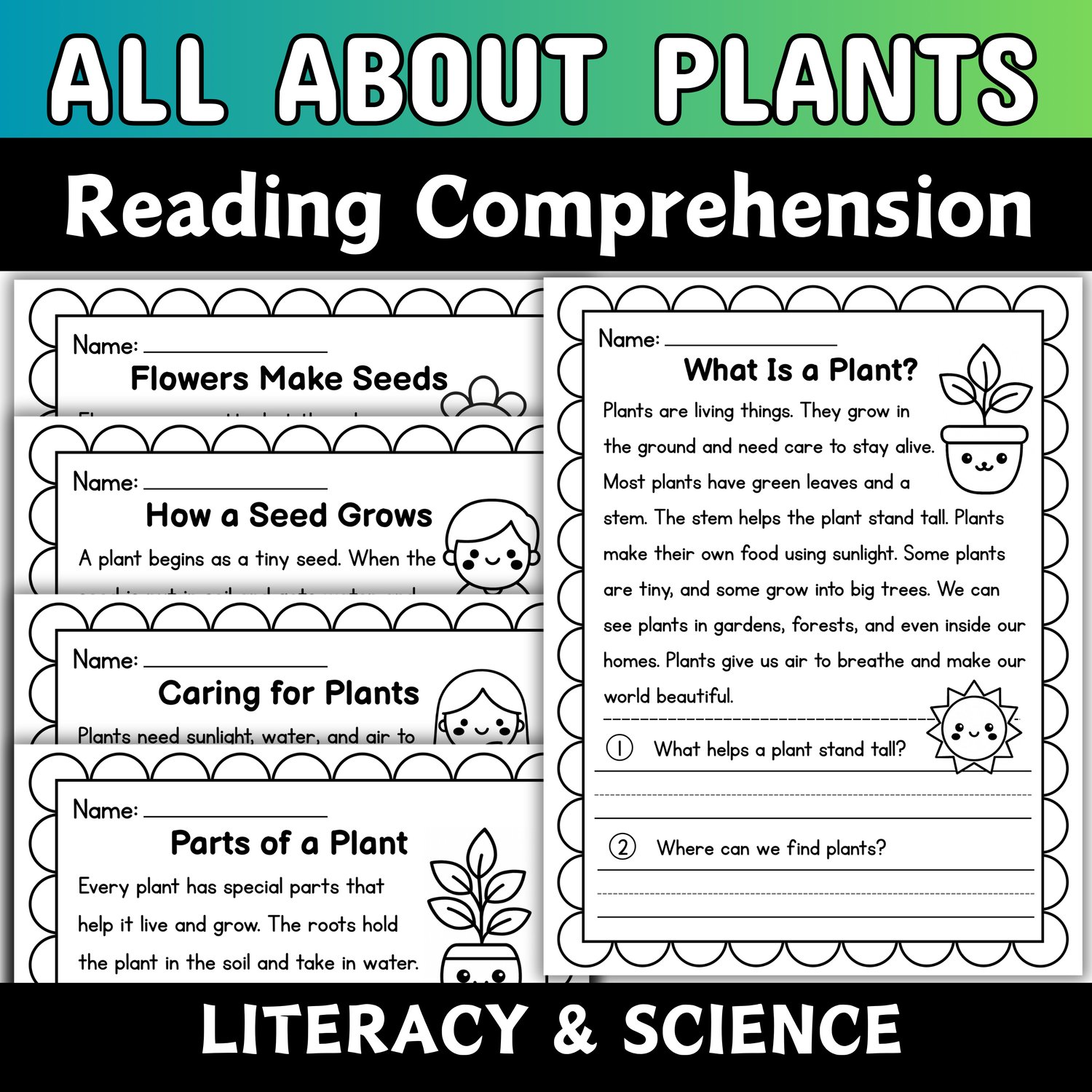Bring science and reading together with this engaging 8-page nonfiction comprehension bundle all about plants! Each page introduces a different plant topic, helping students build science knowledge while practicing reading skills.