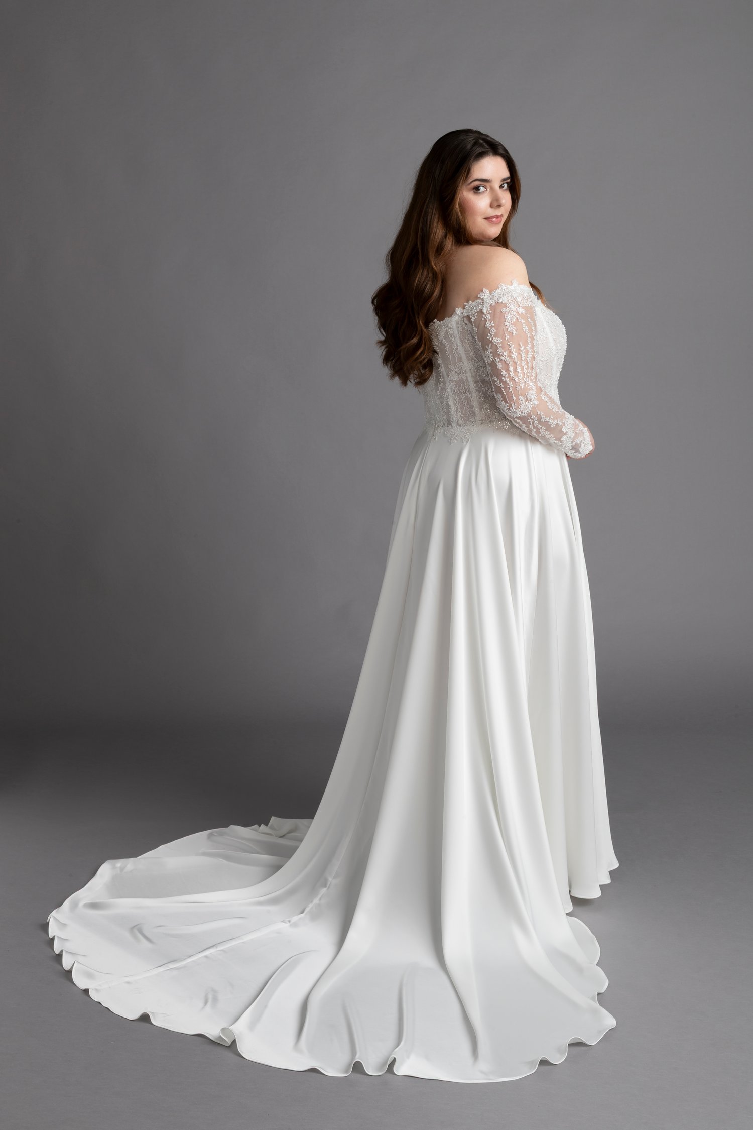 Il ricamo nel corpino illumina il decoltee, le maniche vestono le braccia senza allargare.