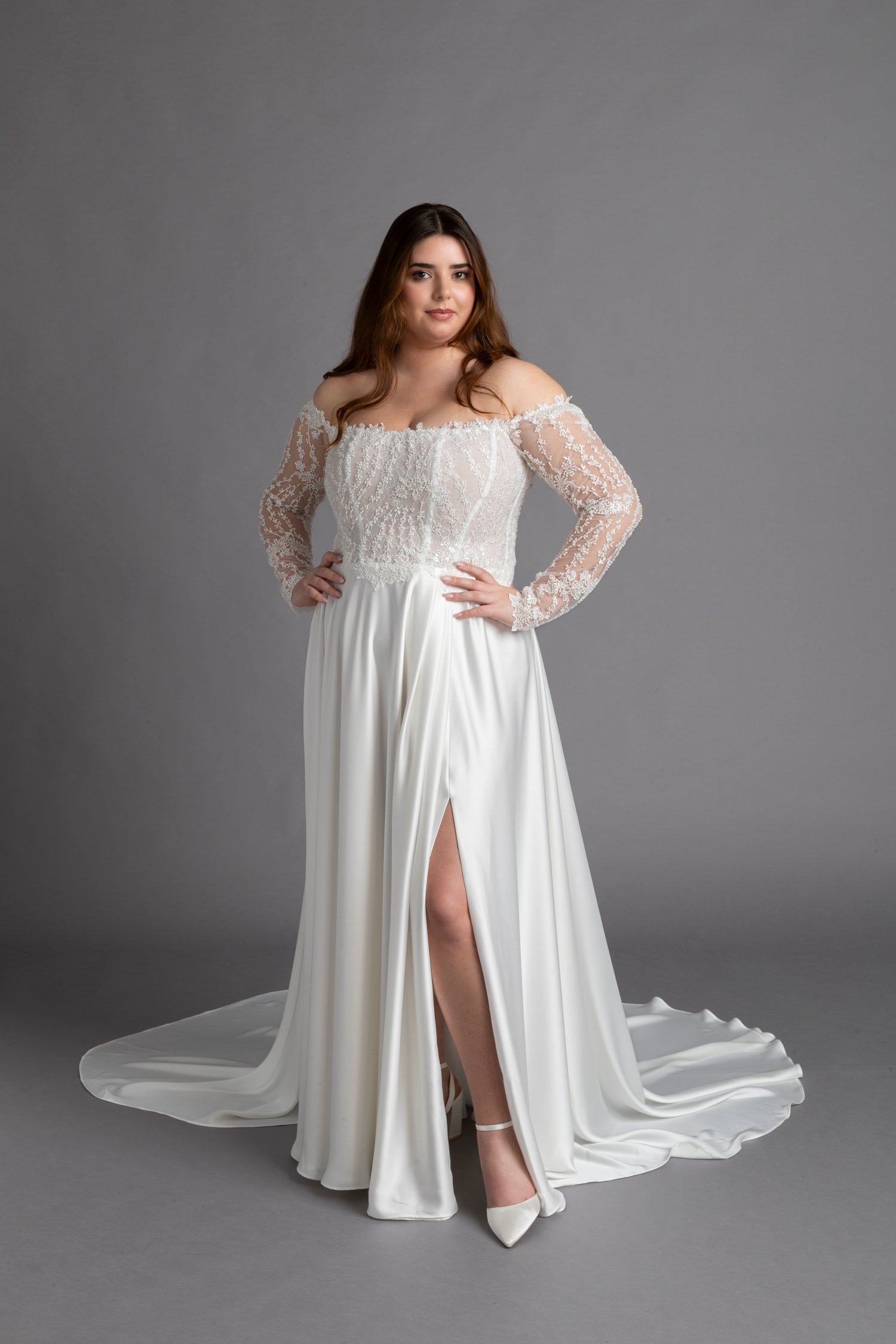 Amanda nasce dalla Tela sartoriale studiata per anfatizzare le spalle,la gonna leggera in satin scivola sul corpo, accarezza i fianchi, senza allargare, lo spacco dona un tocco di sensualità.