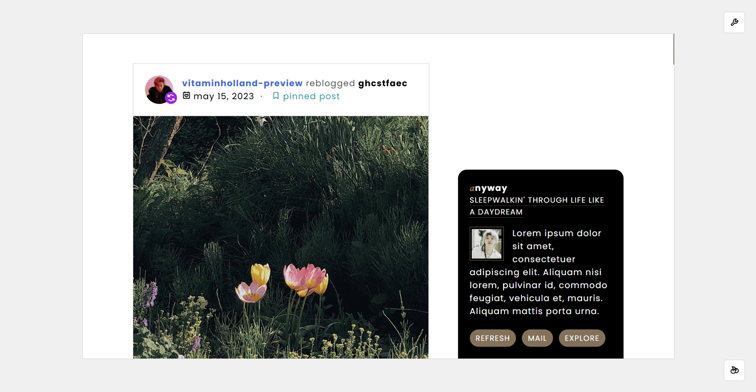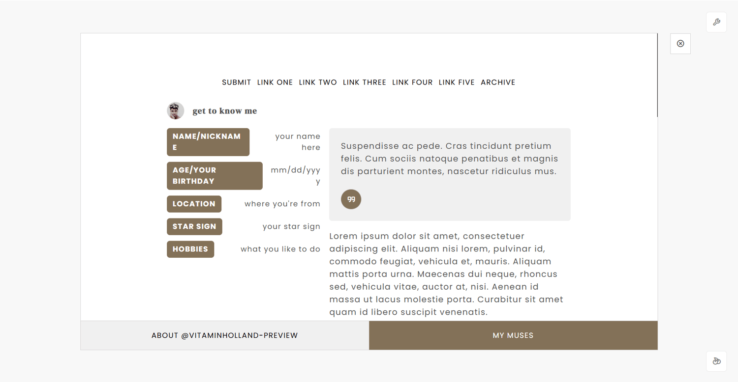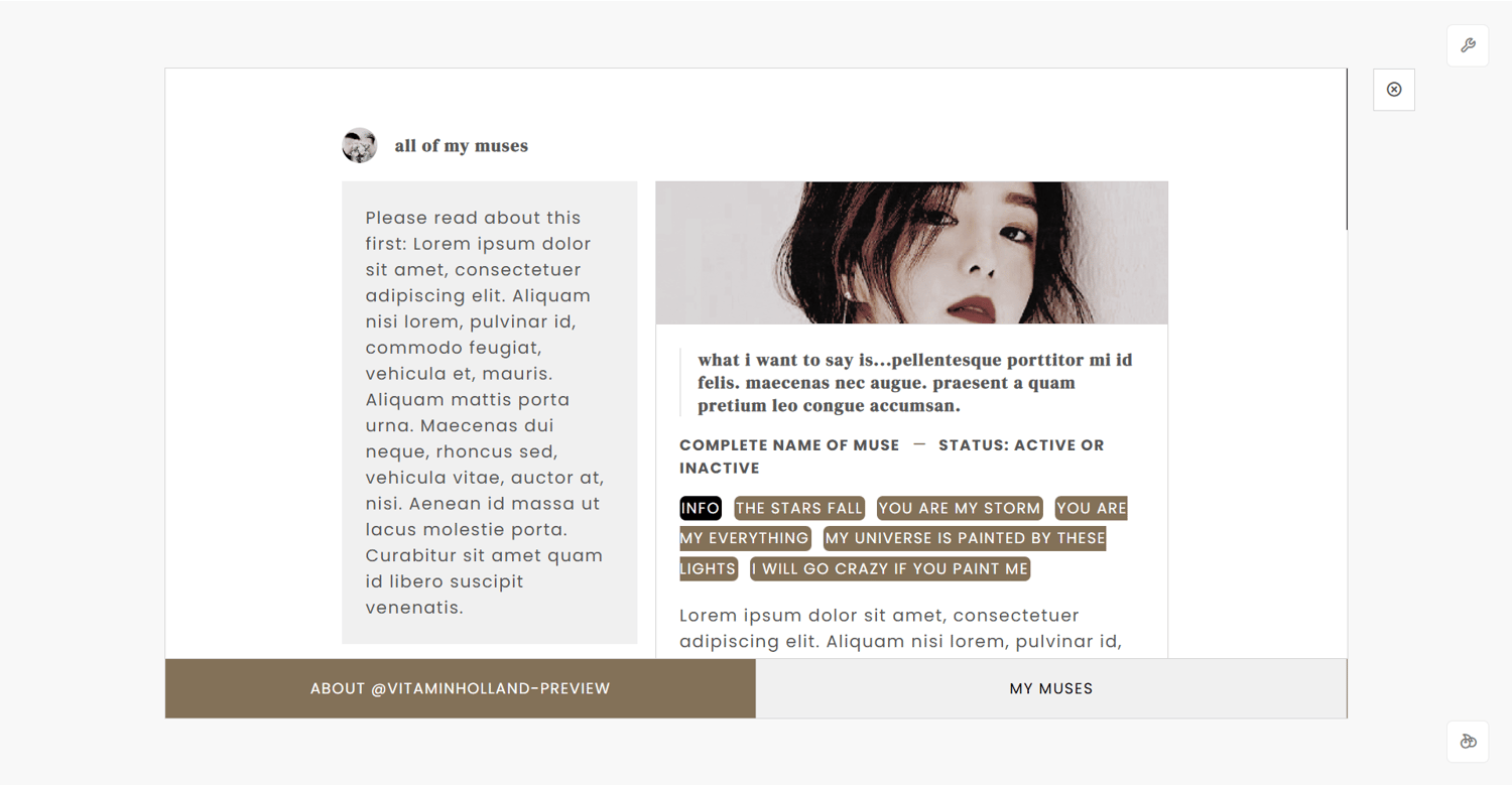 features: 50x50px icon image, blog title, blog subtitle, five custom links, tab 1 features: about section: title with 30x30px icon image, about title, about info section, about quote section and about section; tags section: title with 30x30px icon image, tags cell: tags category title and tags links, tab 2 features: title with 30x30px icon image, notes section where you can put your rules and other stuff, muse section with 433x120px muse image, muse quote, muse name and status, muse info and muse about, 450px to 540px text posts